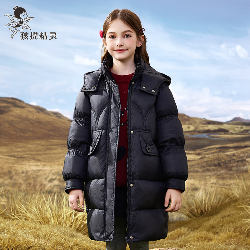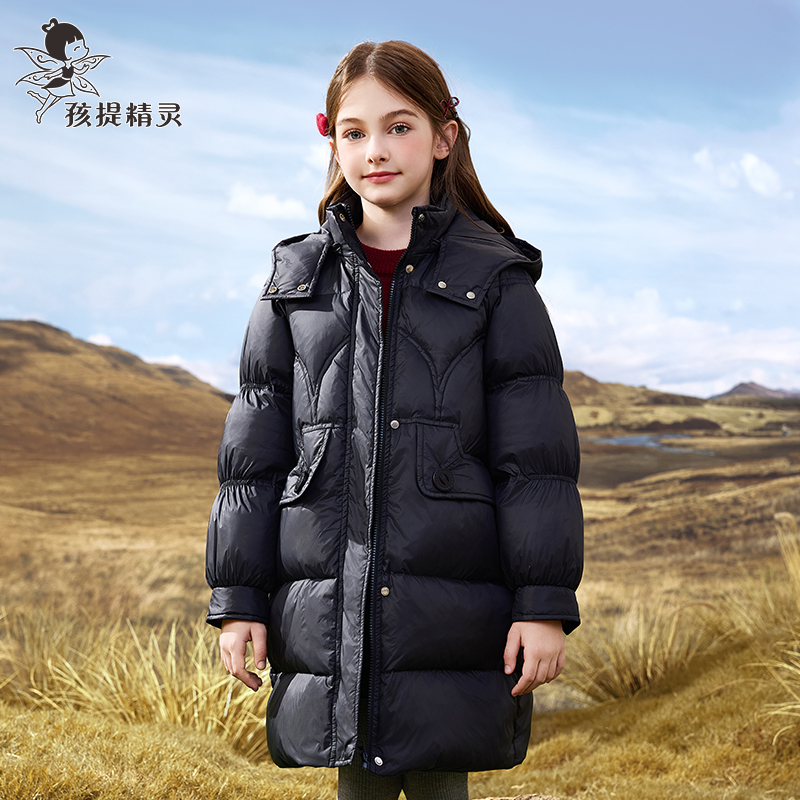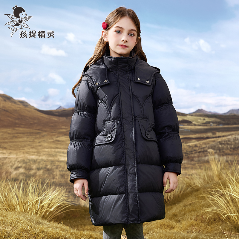 女童黑色中长款90白鸭绒羽绒服2025冬装新款洋气大童加厚外套儿童
