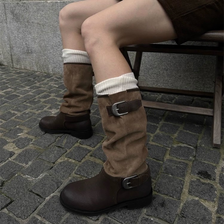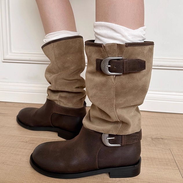 圆头西部靴拼色骑士靴复古中筒靴