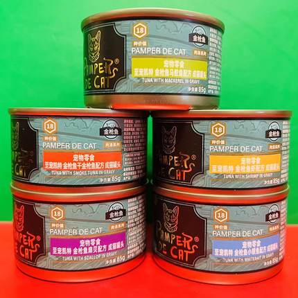 宠物零食!猫罐头85g金枪鱼扇贝银鱼虾肉海鲜肉汤成猫即食湿猫粮