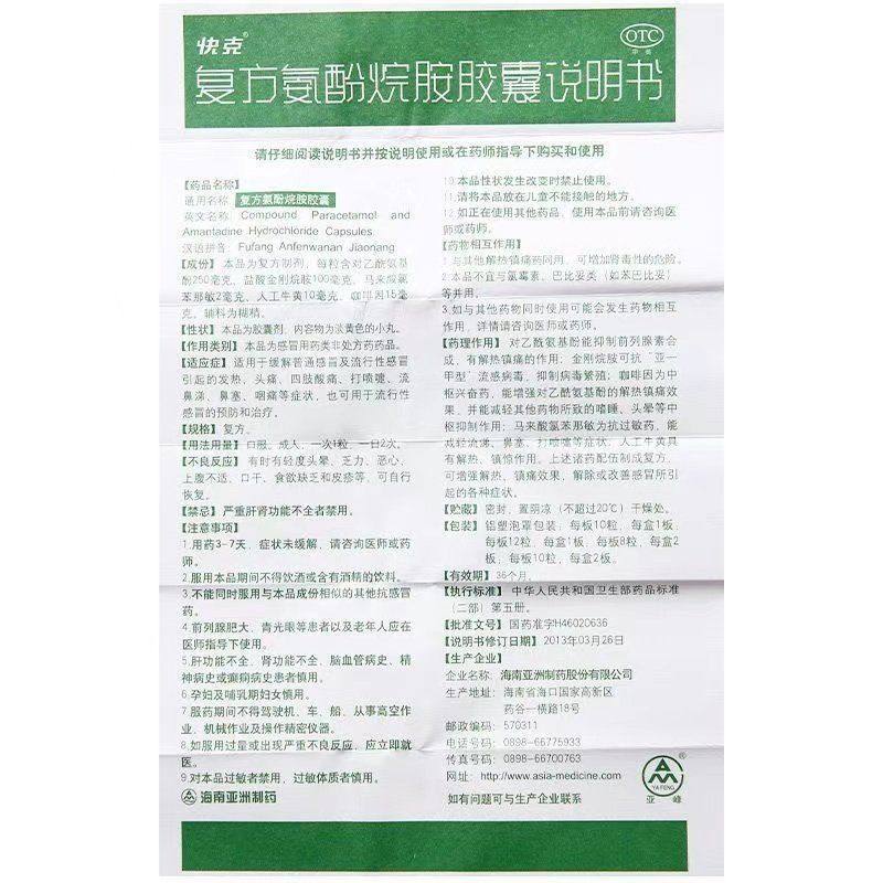 快克复方氨酚烷胺胶囊10粒/盒发热头疼咽痛流鼻涕流感预防感冒药