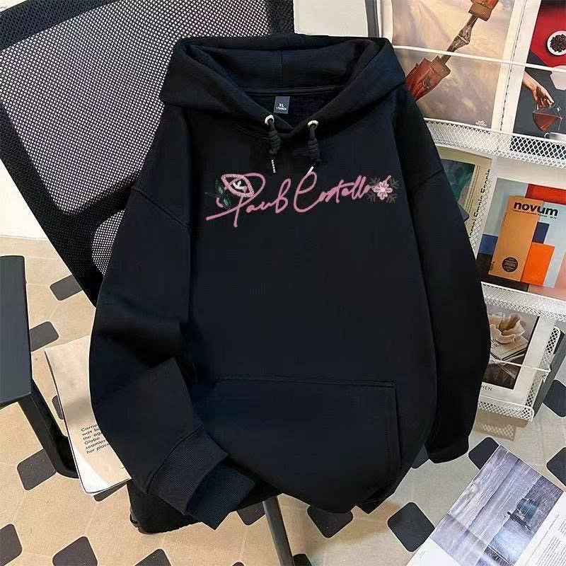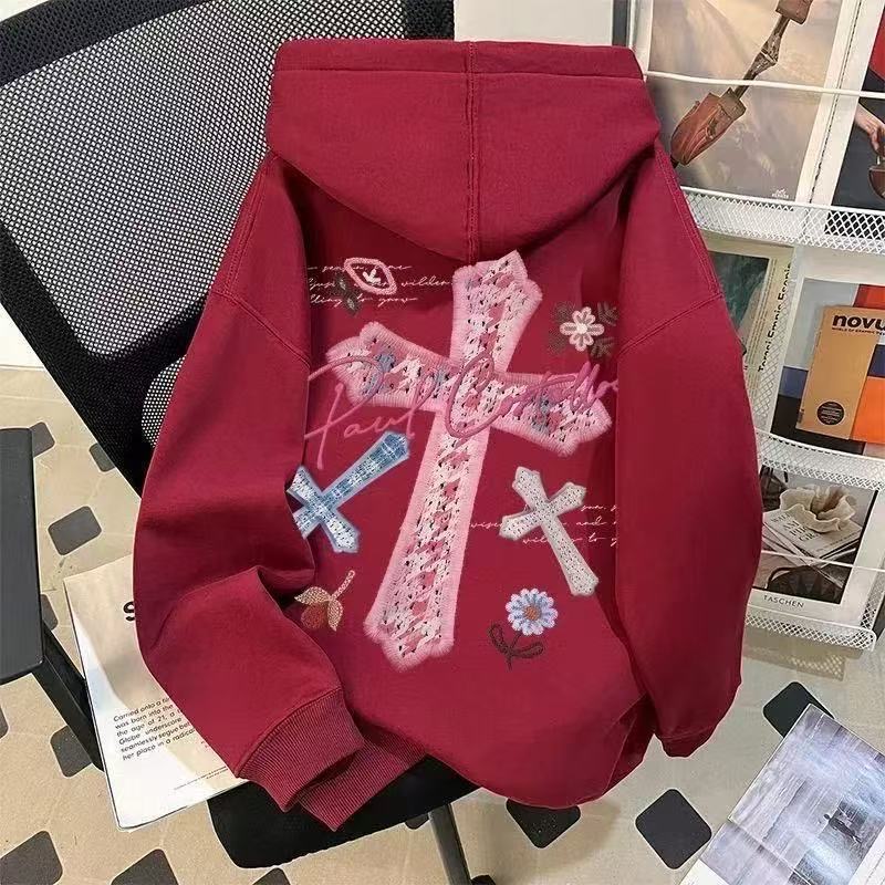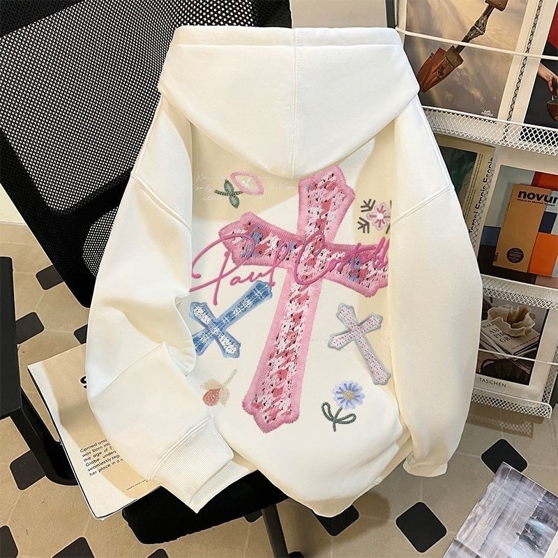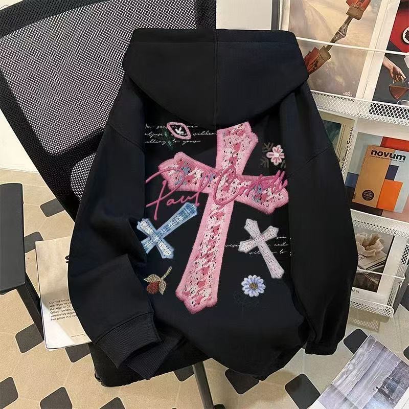 美式潮牌仿刺绣十字架印花连帽卫衣男女冬宽松加绒百搭外套上衣潮