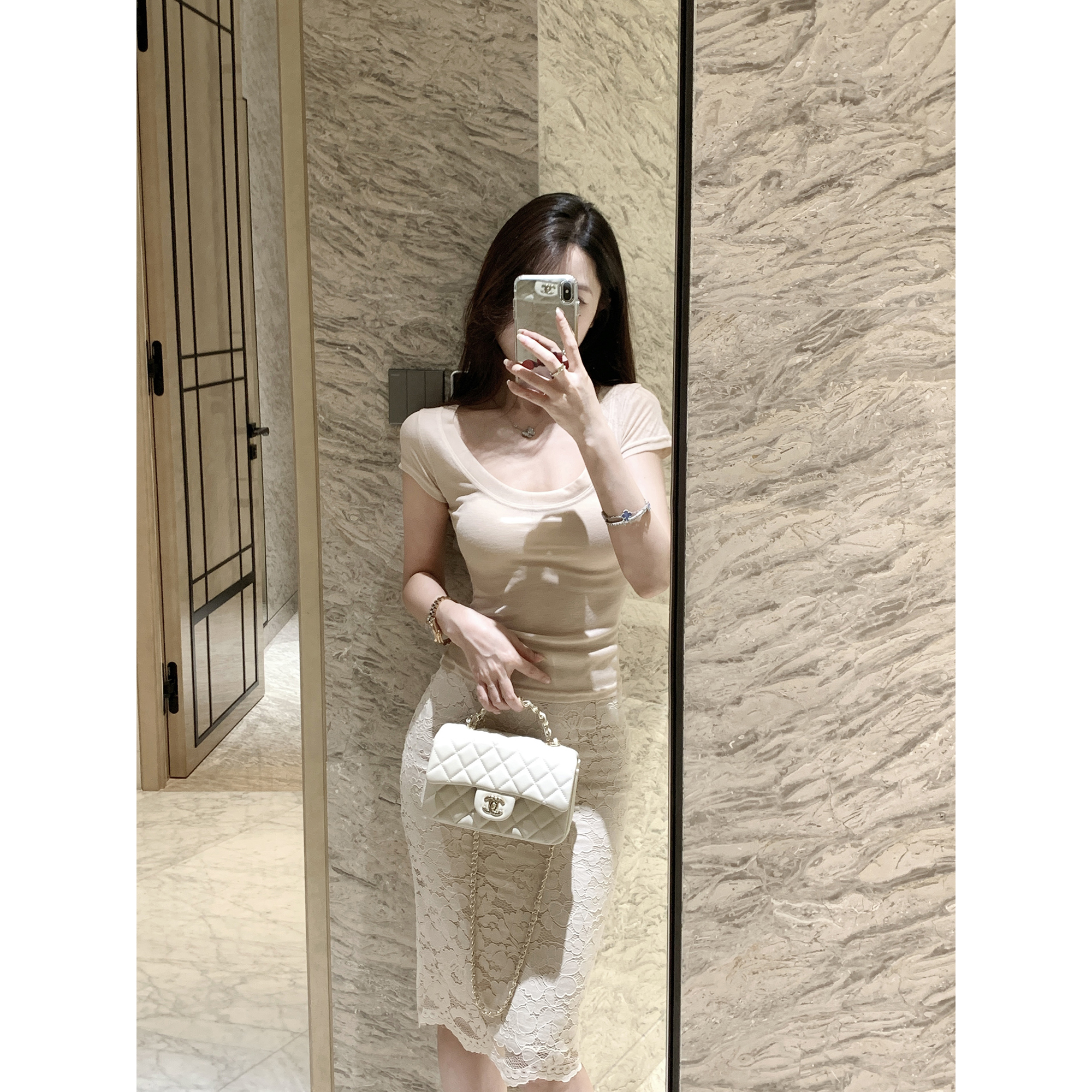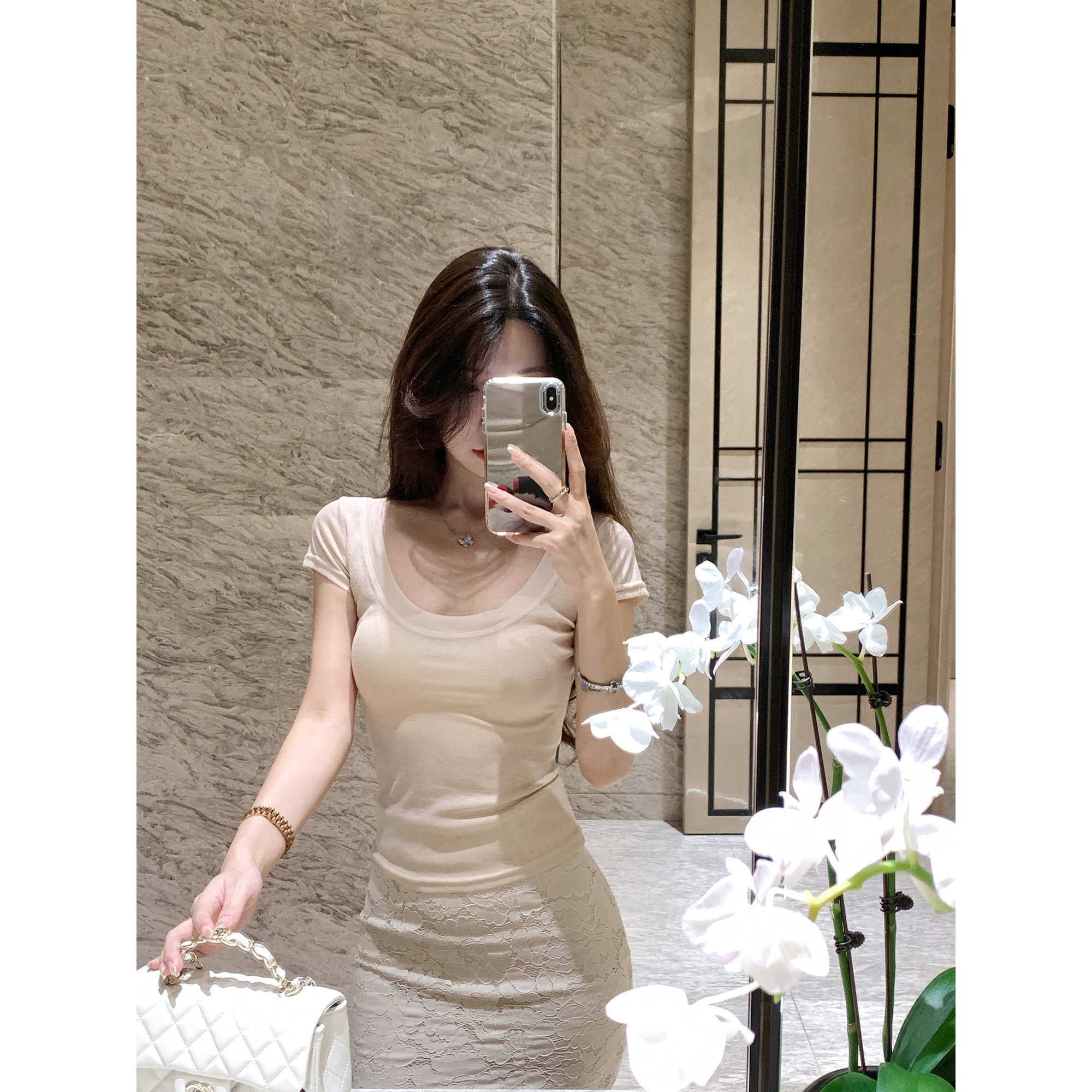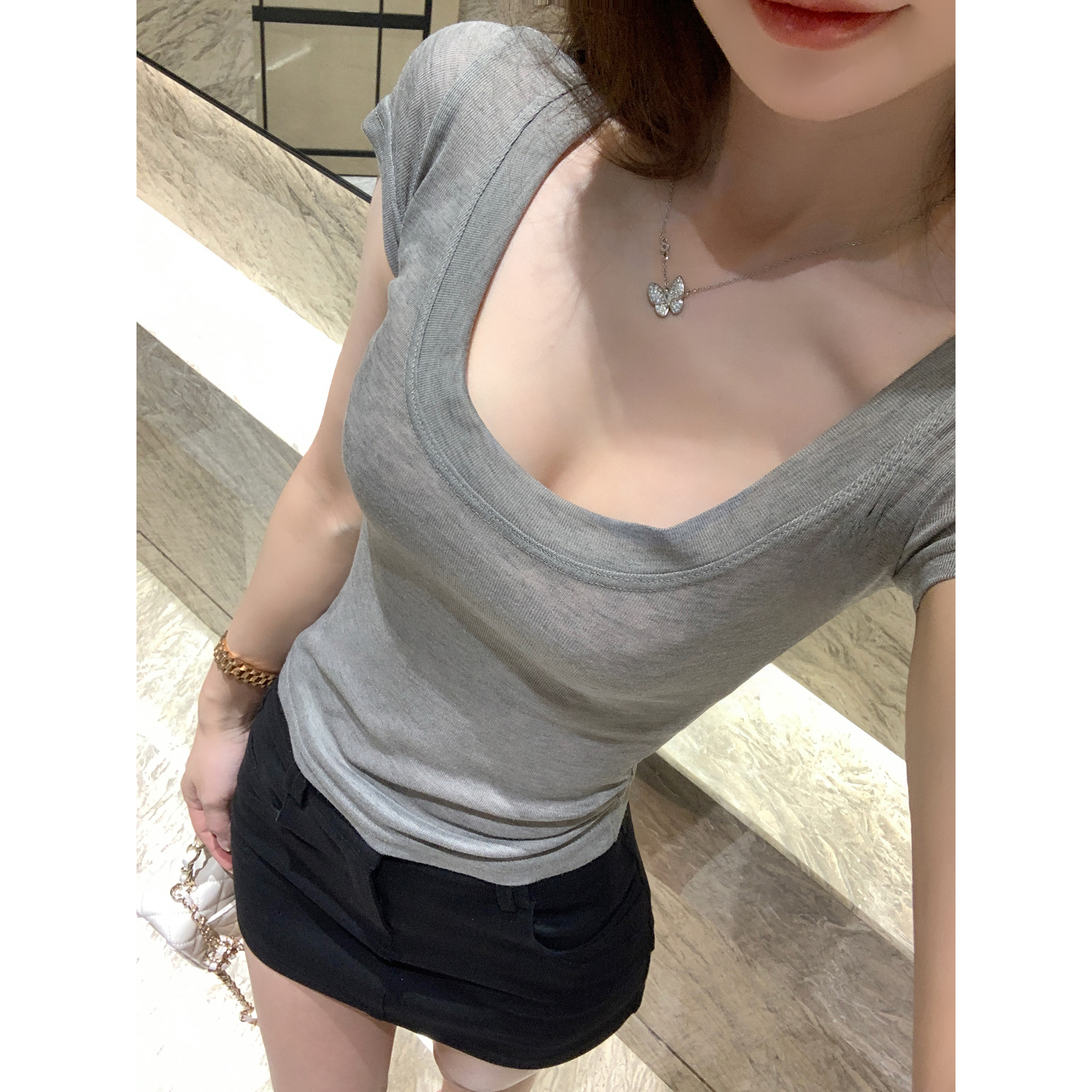JustQin【少女时节】2025新款夏装弹力修身上衣性感u领短袖T恤女