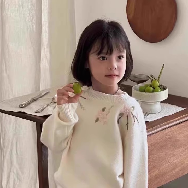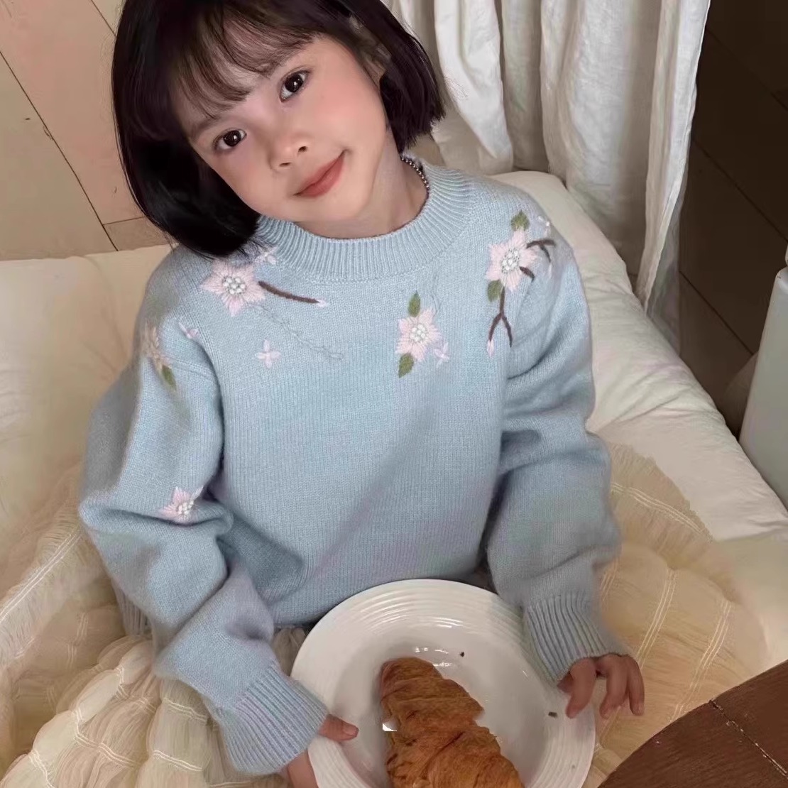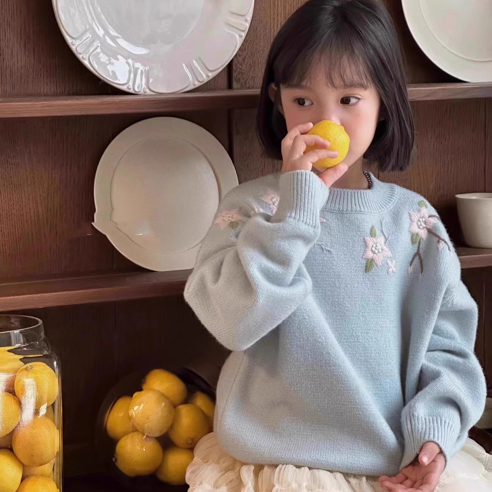 女童圆领毛衣羊绒衫2024秋冬装新款中大童儿童绣花纯色针织毛衣