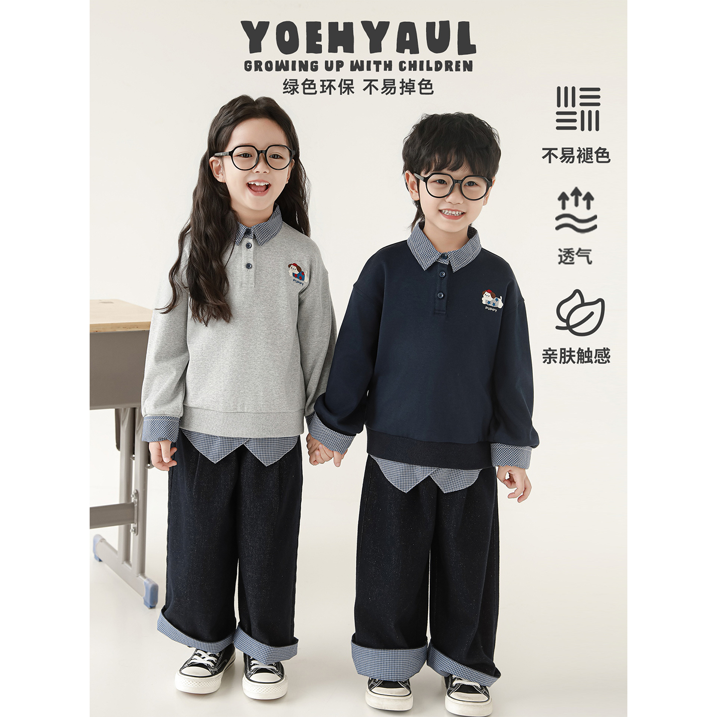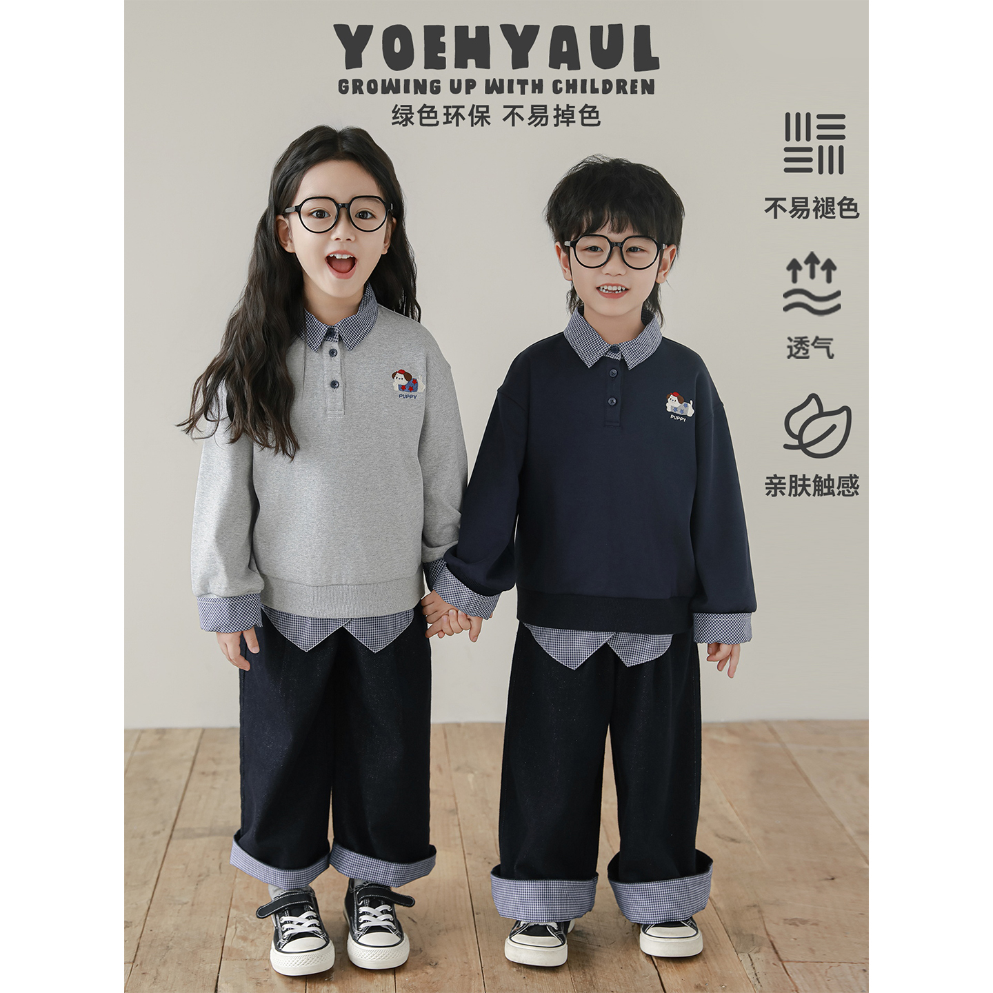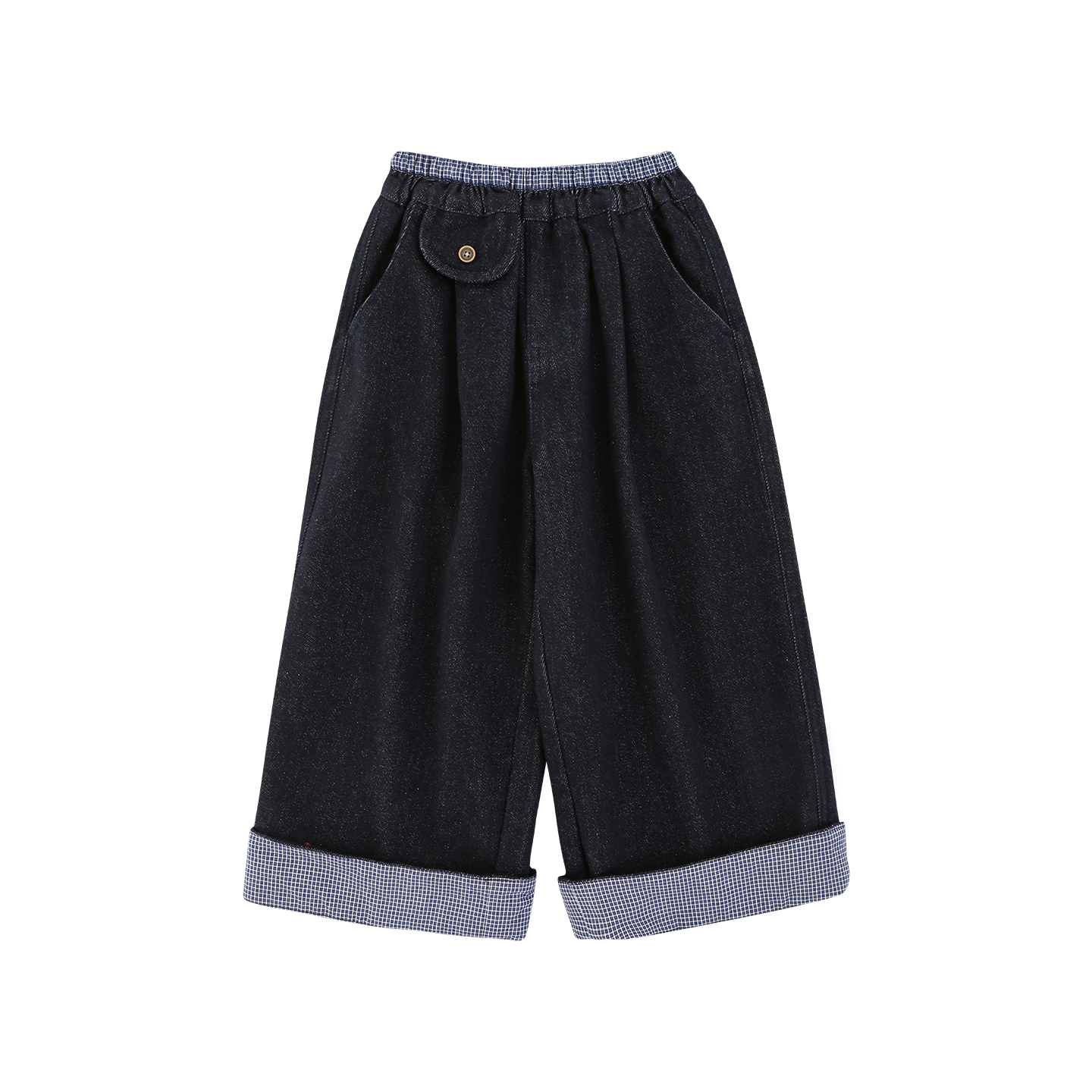幼悠女童潮流时尚牛仔裤秋季格纹翻折不易褪色宽松百搭休闲裤子潮