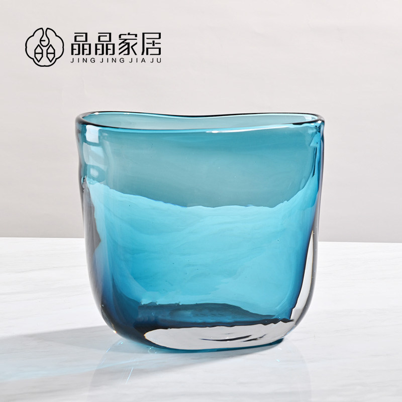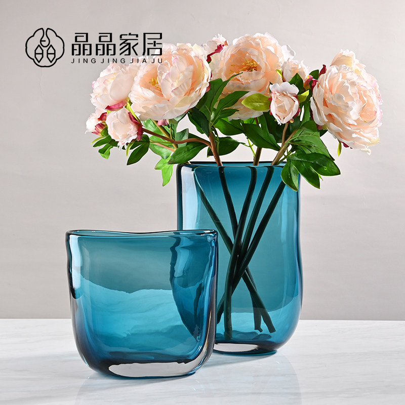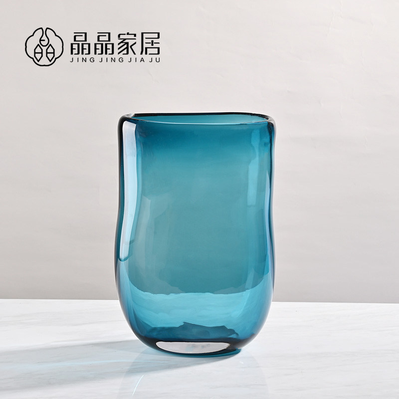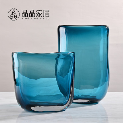 现代简约蓝色大号玻璃花瓶扁口型厚重瓶子客厅摆场陈列玄关饰品