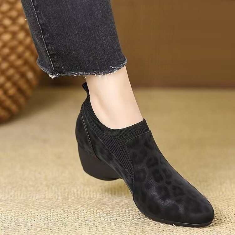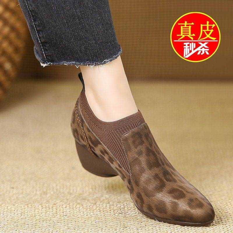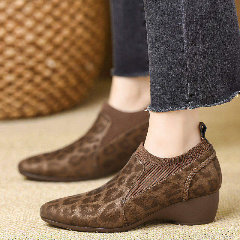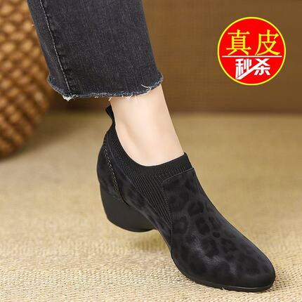 品牌真皮针织百搭坡跟单鞋女2026年春秋新款舒适一脚登洋气妈妈鞋