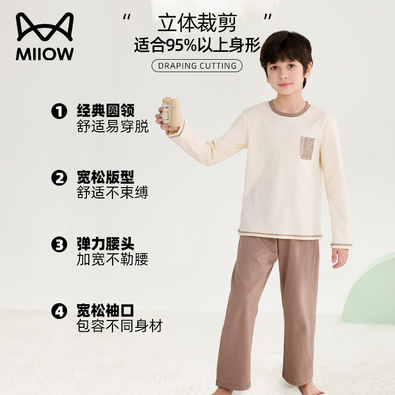 猫人儿童睡衣纯棉薄款男童春秋季长袖套装女孩中大童全棉家居服夏
