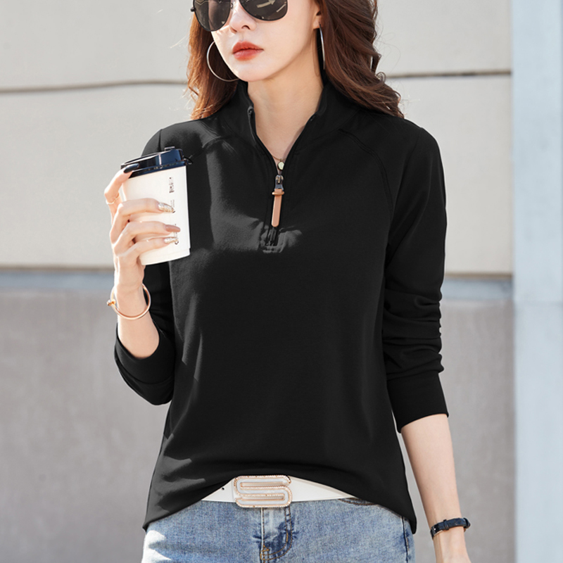 纯棉立领拉链长袖t恤女打底衫2025春秋新款翻领内搭休闲运动上衣