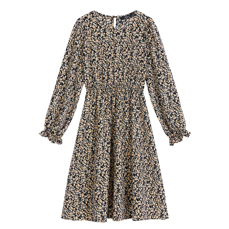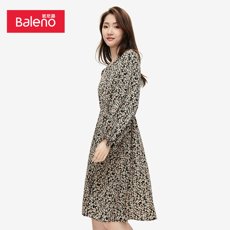 班尼路秋季新品女装梨形身材时尚休闲法式复古收腰碎花长袖连衣裙