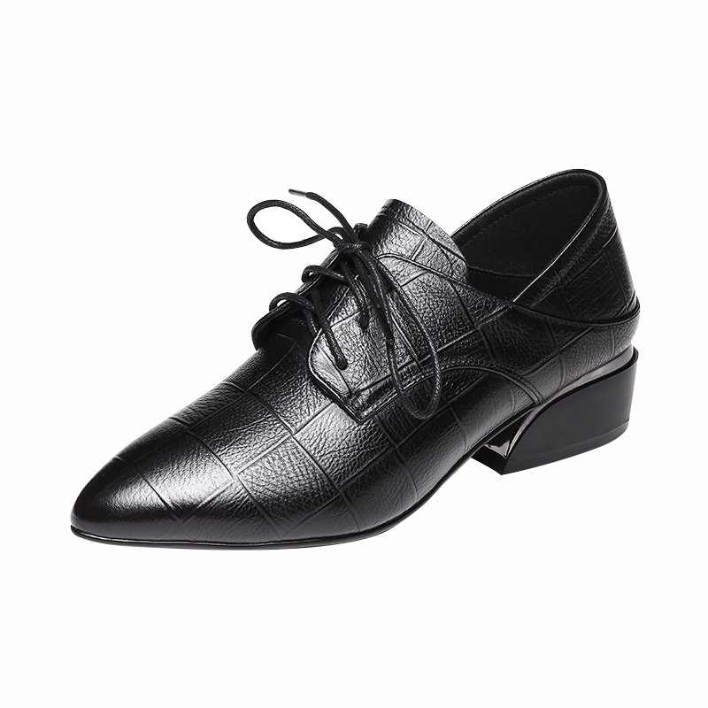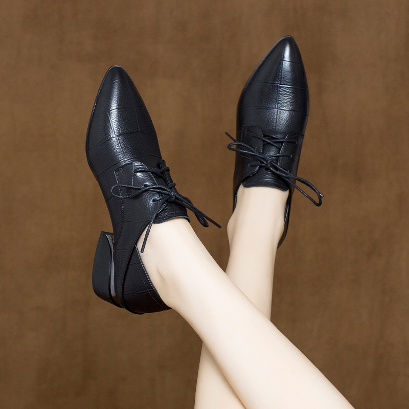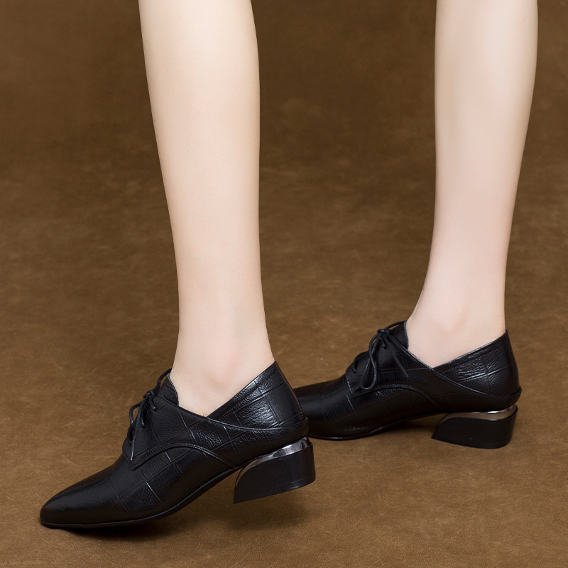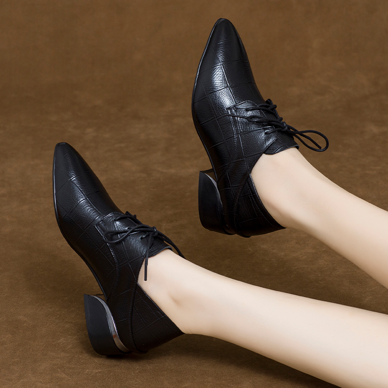 2025新款春秋季女鞋软皮尖头粗跟系带深口单鞋软底中跟真皮小皮鞋