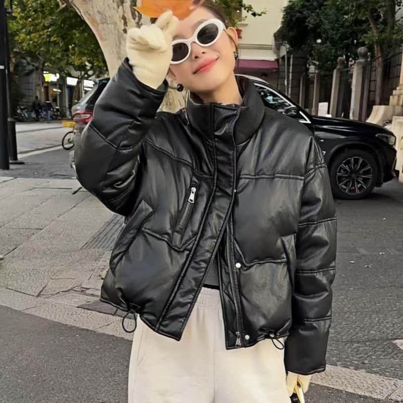 2025冬季新款宽松PU蛋白皮衣羽绒服女短款加厚保暖白鸭绒外套潮