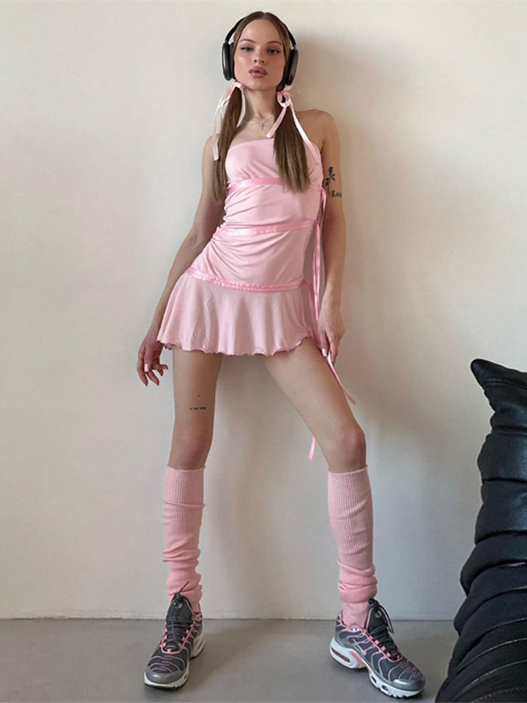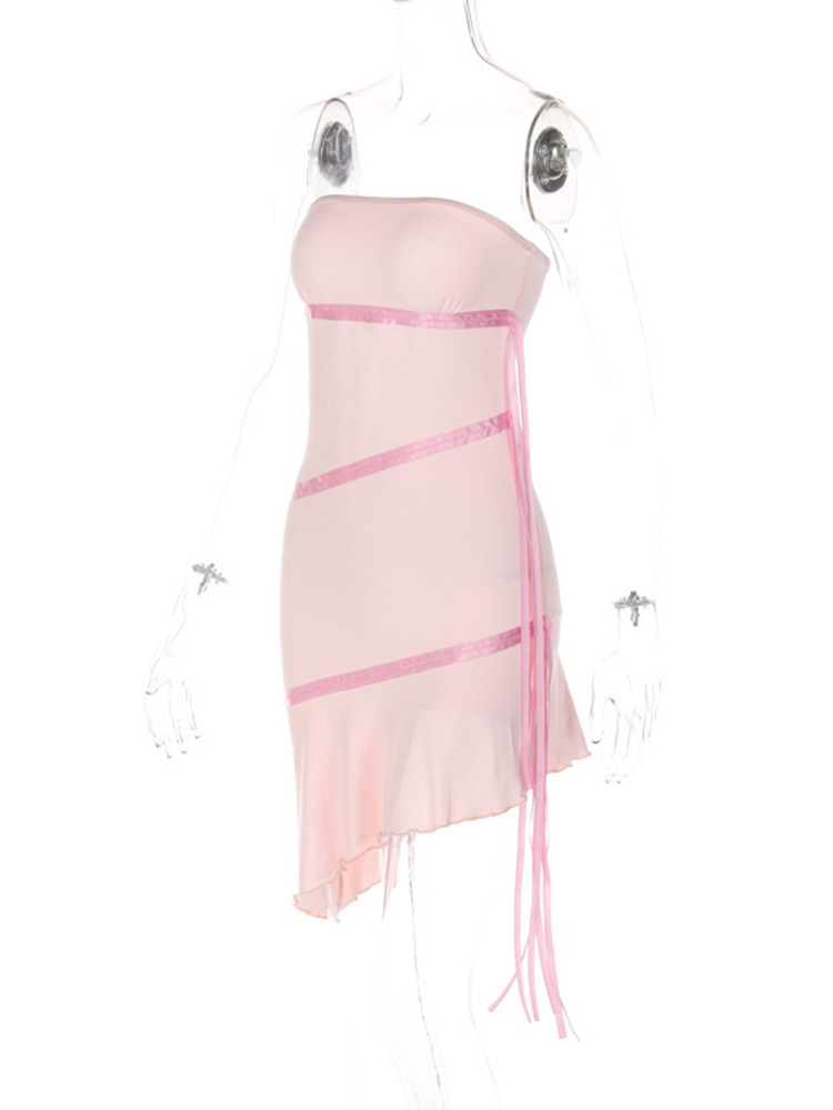 Ahagaga 欧美甜辣风修身性感一字肩裹胸短裙时尚飘带荷叶边连衣裙