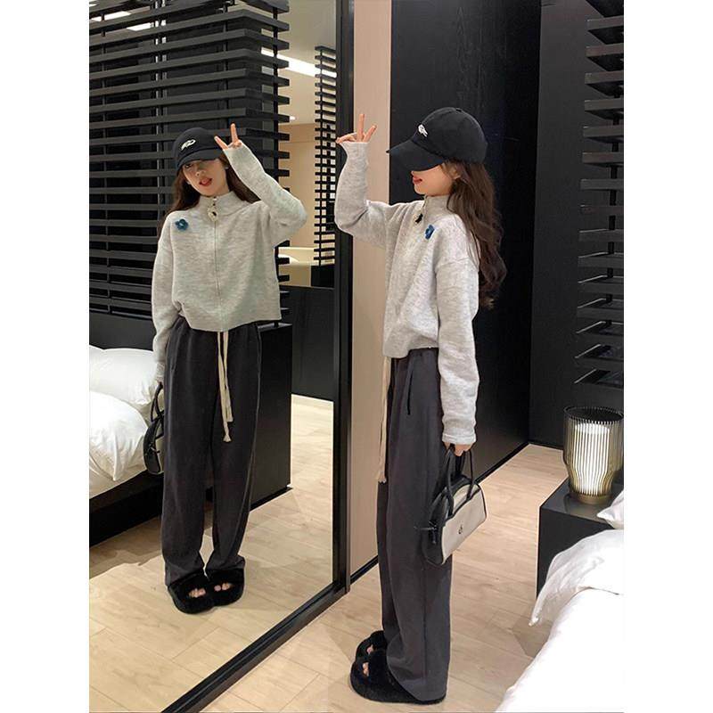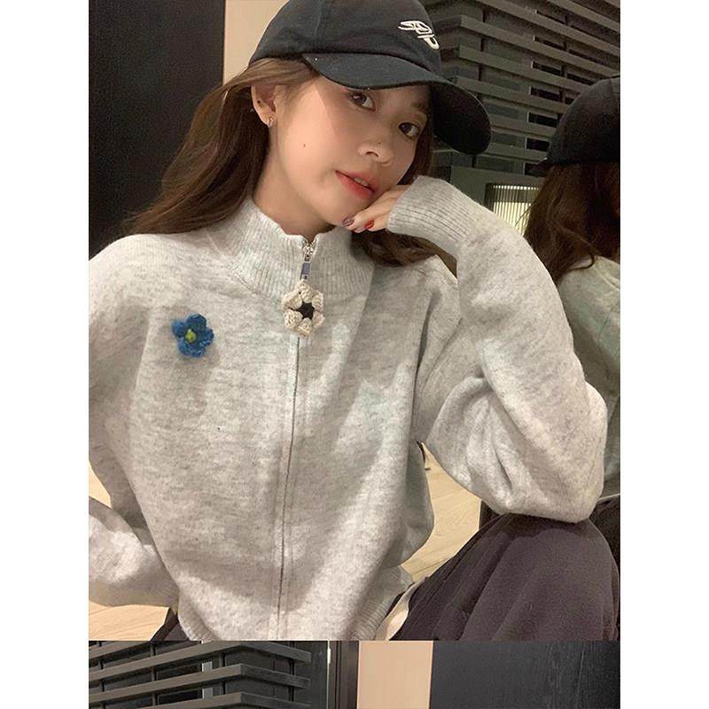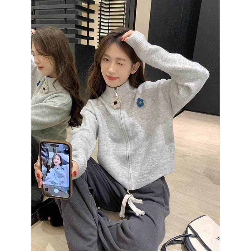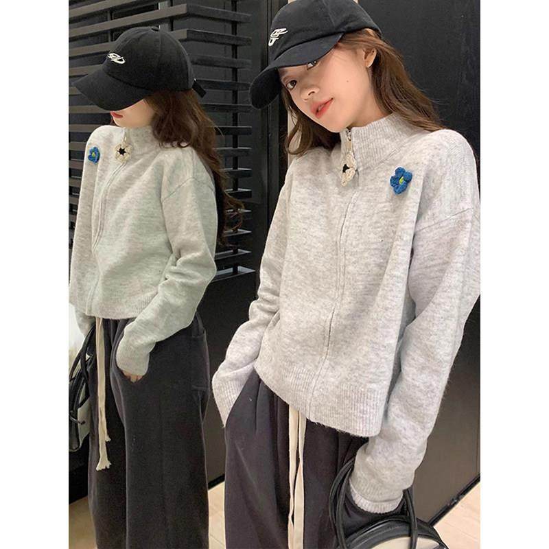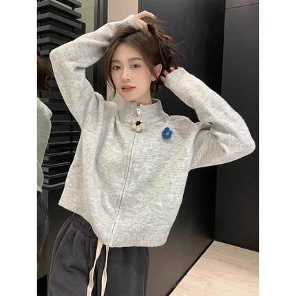 2025春秋新款高领毛衣外套女宽松短款小个子慵懒风韩系灰色针织衫