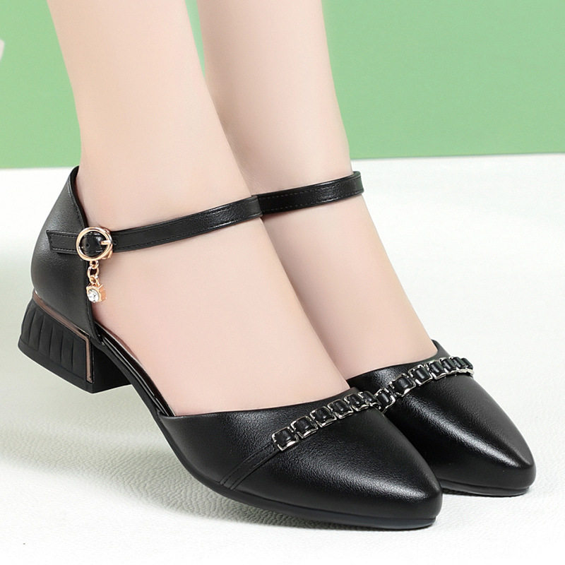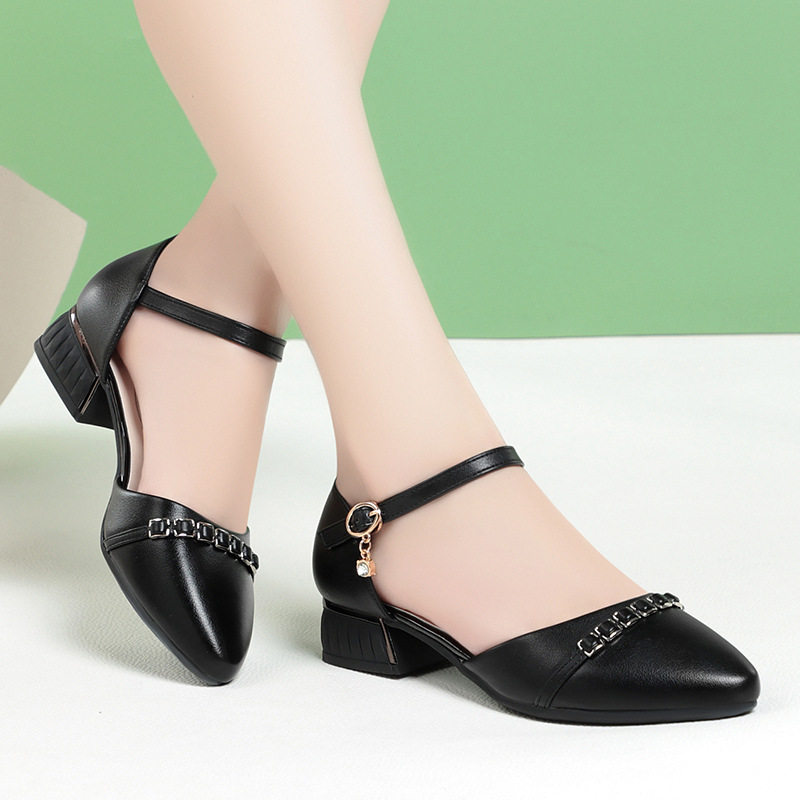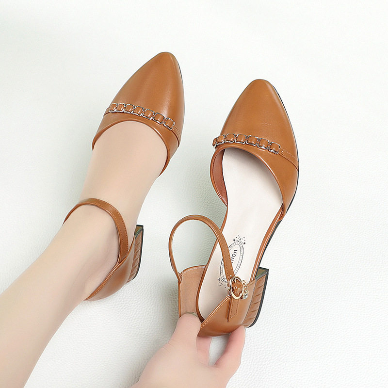 包头凉鞋女年新款夏季中年妈妈鞋子软皮焦糖色一字扣中空单鞋