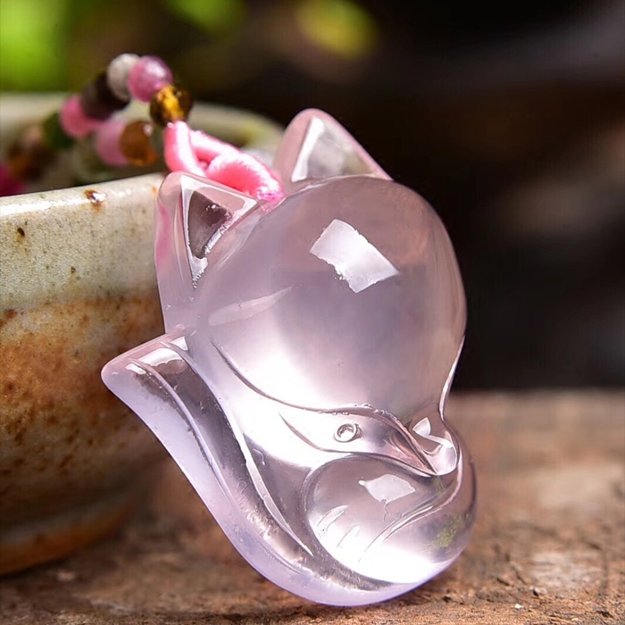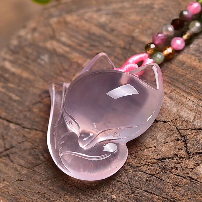 天然粉晶狐狸吊坠 粉水晶萌狐项坠 碧玺项链绳锁骨链 粉狐狸挂坠