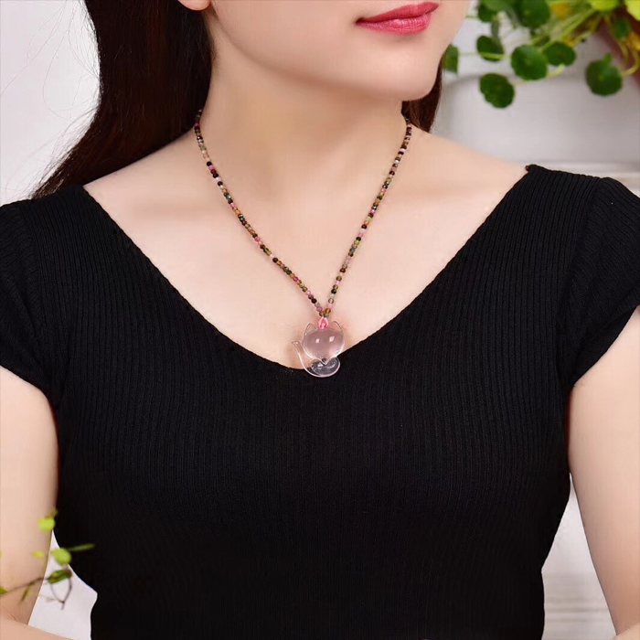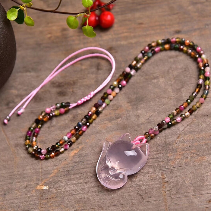 天然粉水晶狐仙碧玺项链绳吊坠