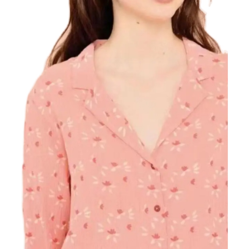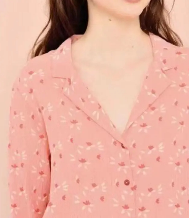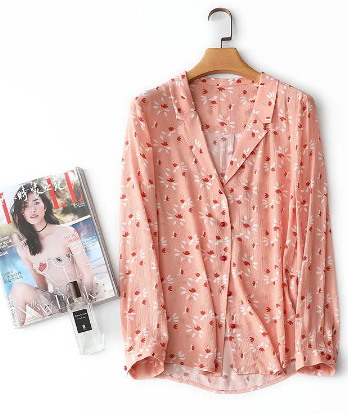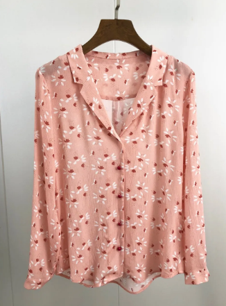 法式 纯元DPH100%人造丝花瓣印花时尚别致桃红色V领纽扣女士衬衫