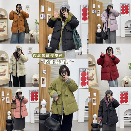 宛宛大码羽绒服拼色中长款200斤胖mm时尚2026冬新款宽松休闲外套