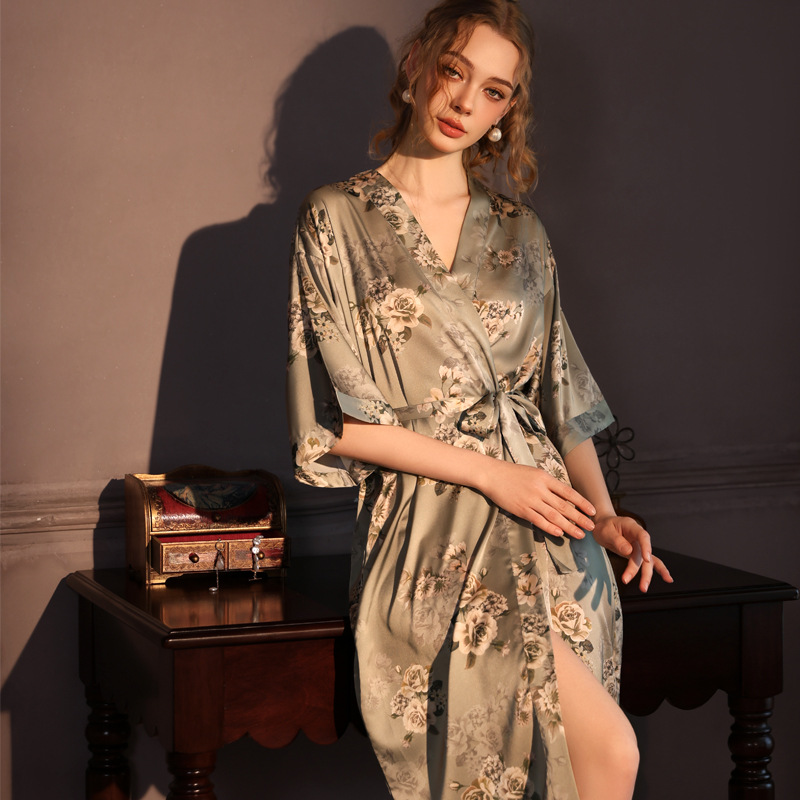 睡袍真丝睡衣女款印花纯欲晨袍薄款性感桑蚕丝家居服女士秋冬长款