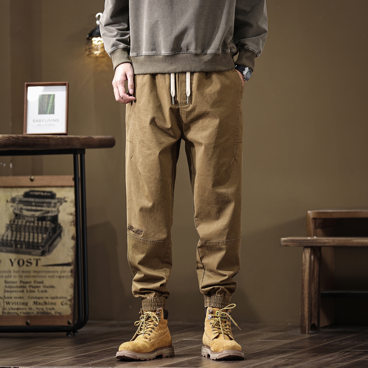 美式复古工装裤男秋季新款宽松大码潮牌拼接卡其色束脚休闲长裤