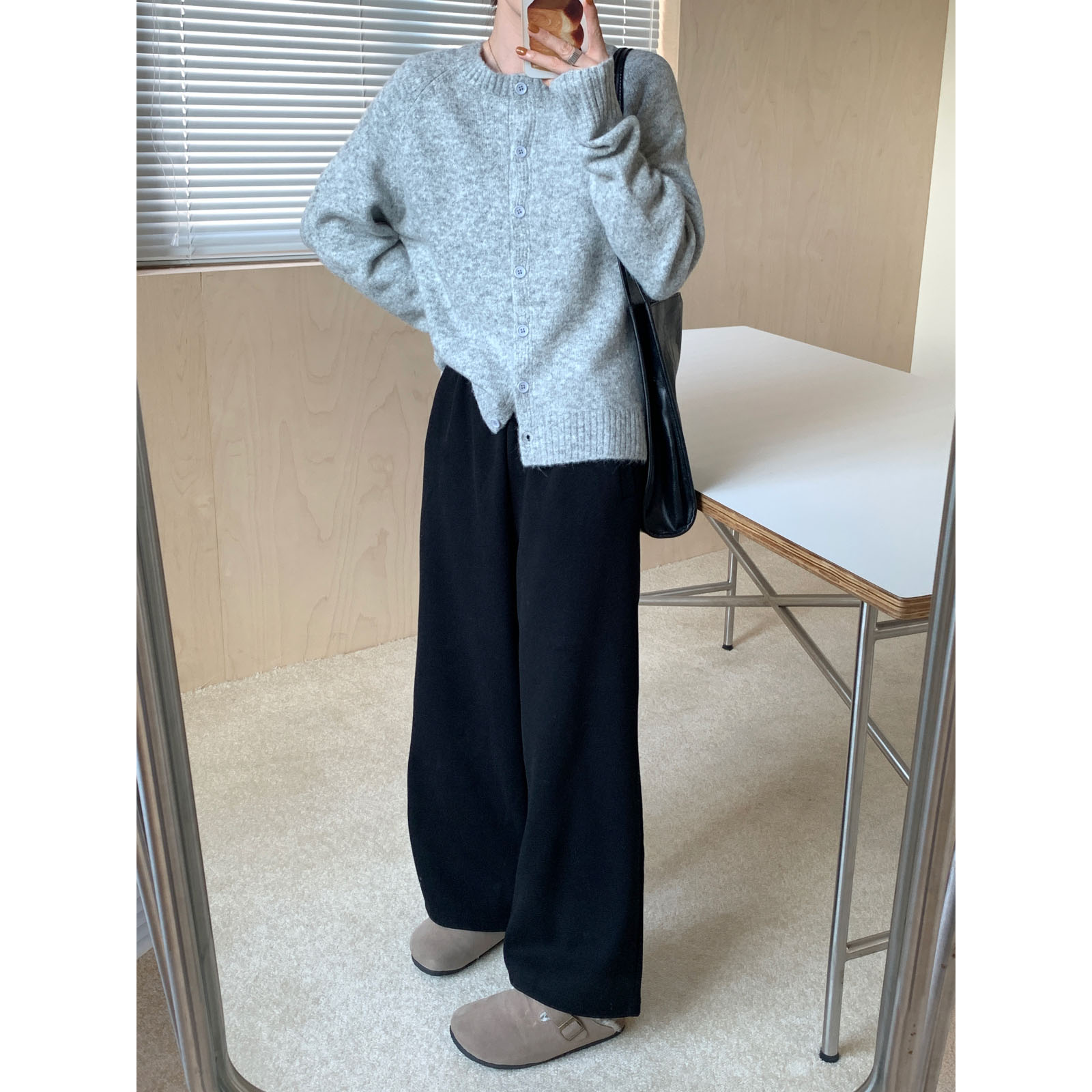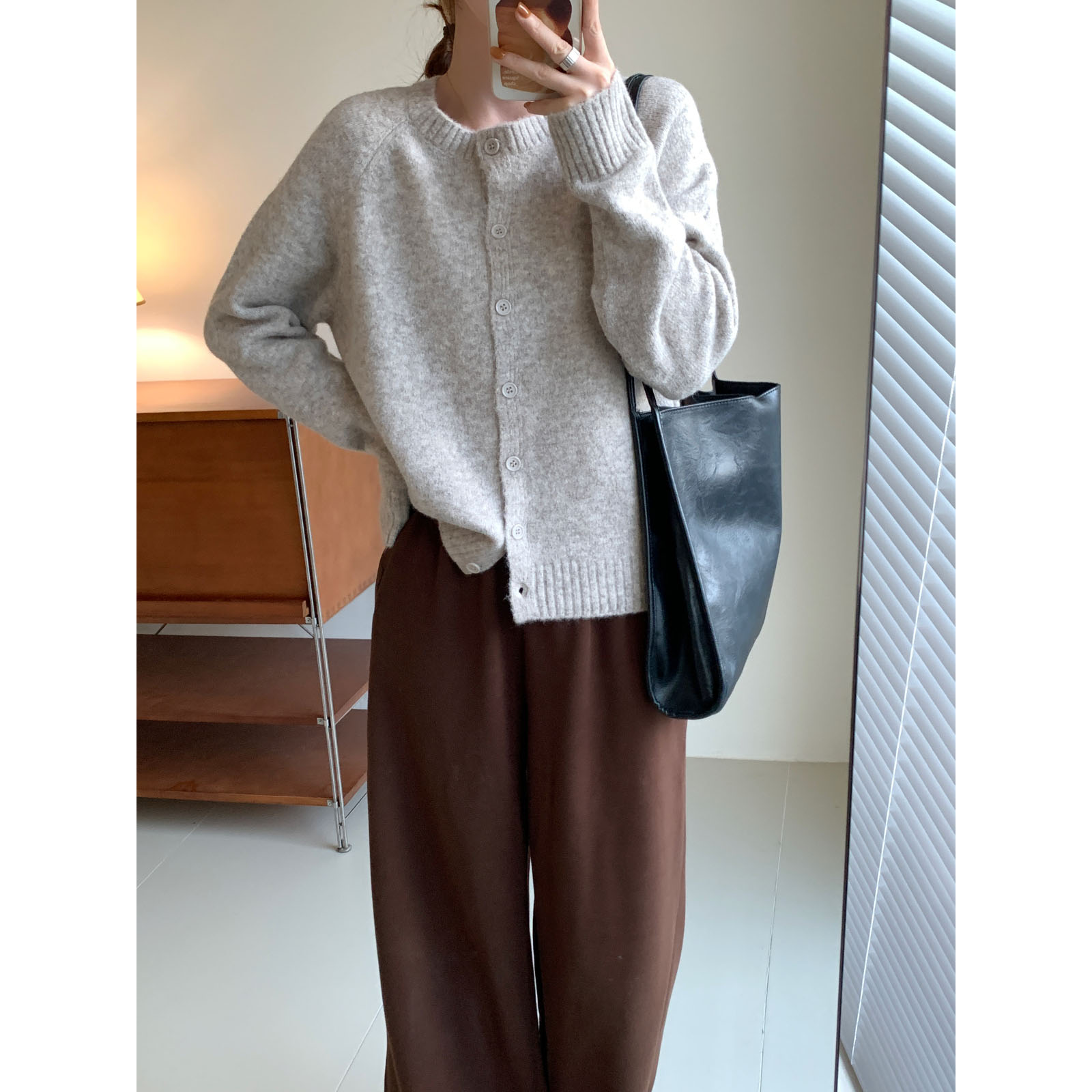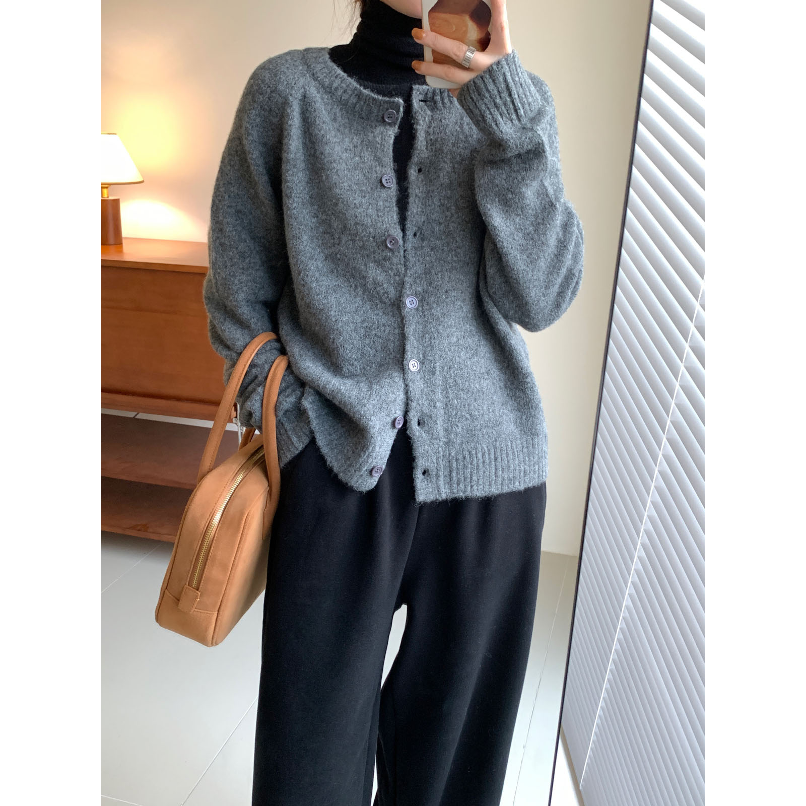简约纯色圆领毛衣开衫