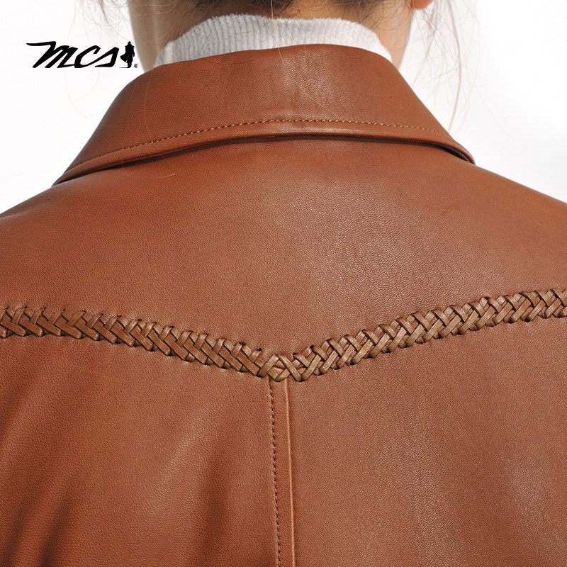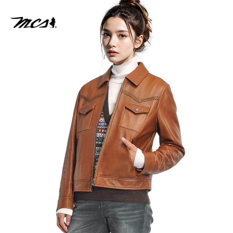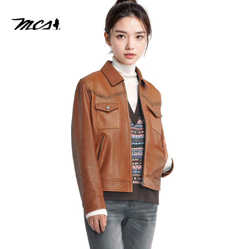 MCS女装皮衣女短款翻领绵羊皮真皮夹克外套经典牛仔工装皮夹克女
