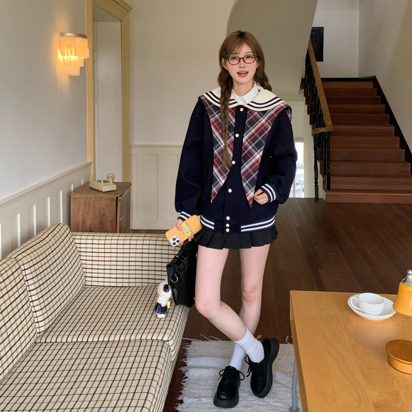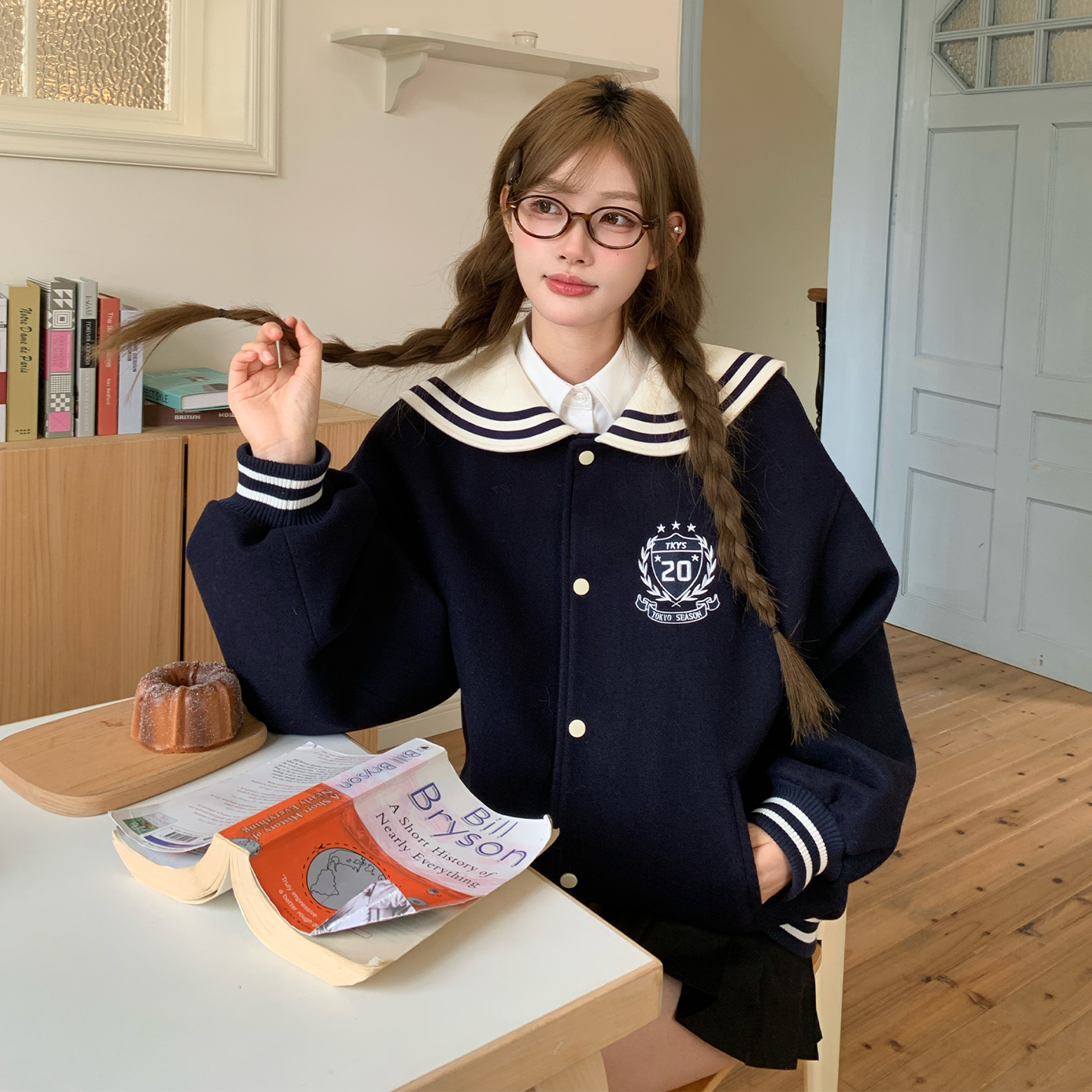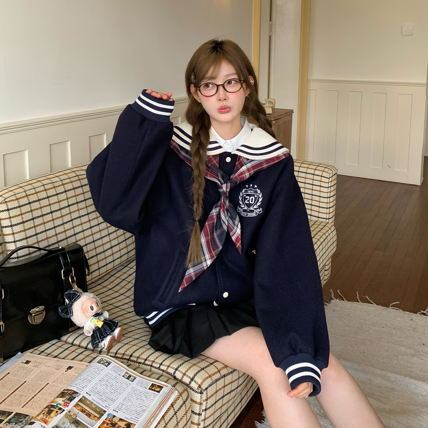 东京岁时记jk原创正版藏青色海军领棒球服秋冬开衫外套女宽松上衣