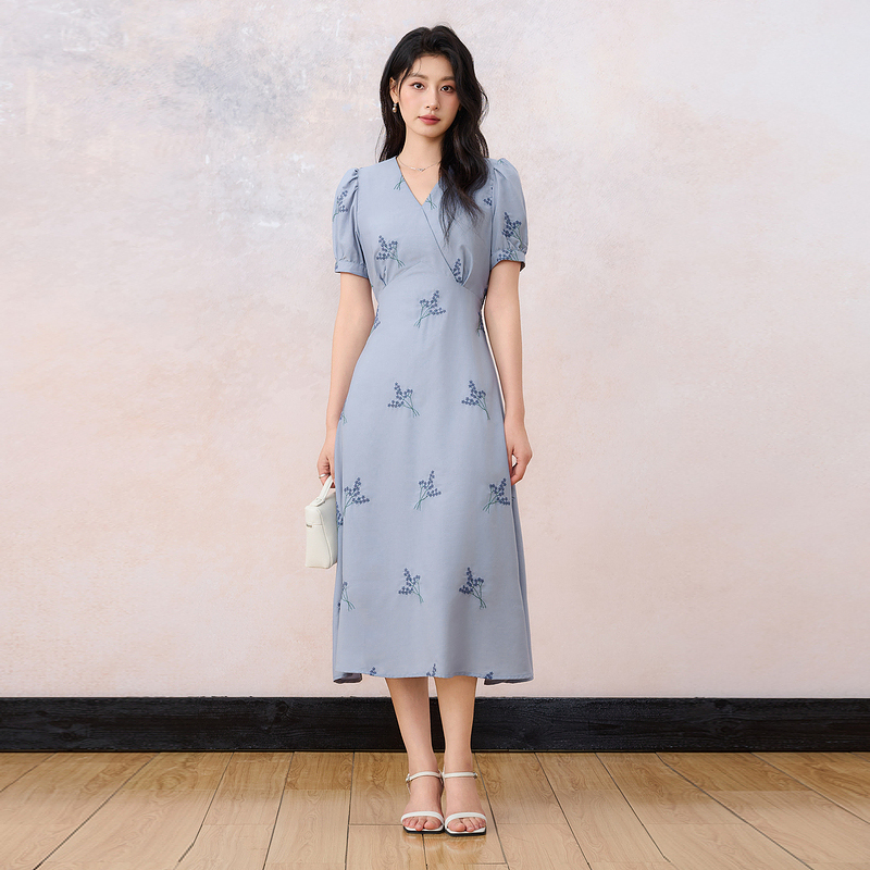 Basic House/百家好提花刺绣连衣裙系带V领优雅中长款裙子夏新款
