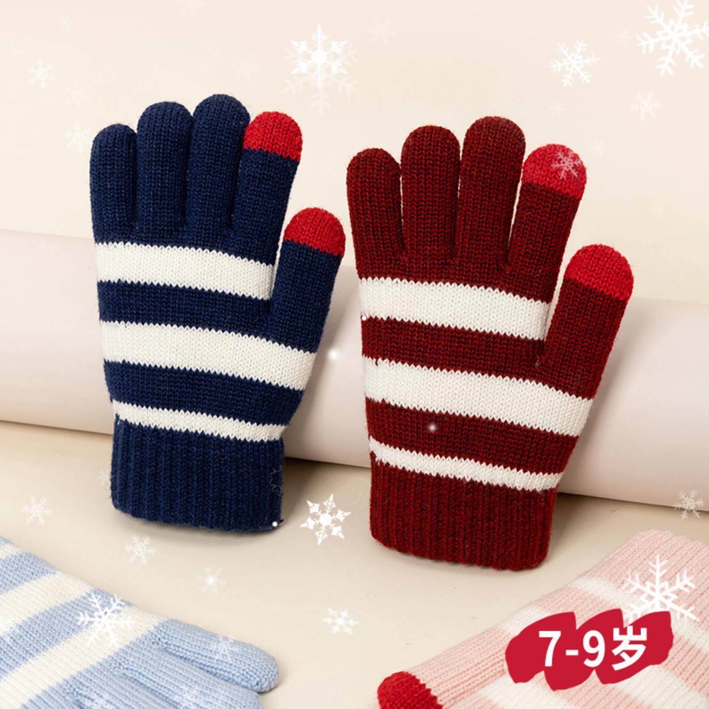 条纹撞色针织五指加厚保暖户外骑车防寒男女冬五指小学生手套加绒