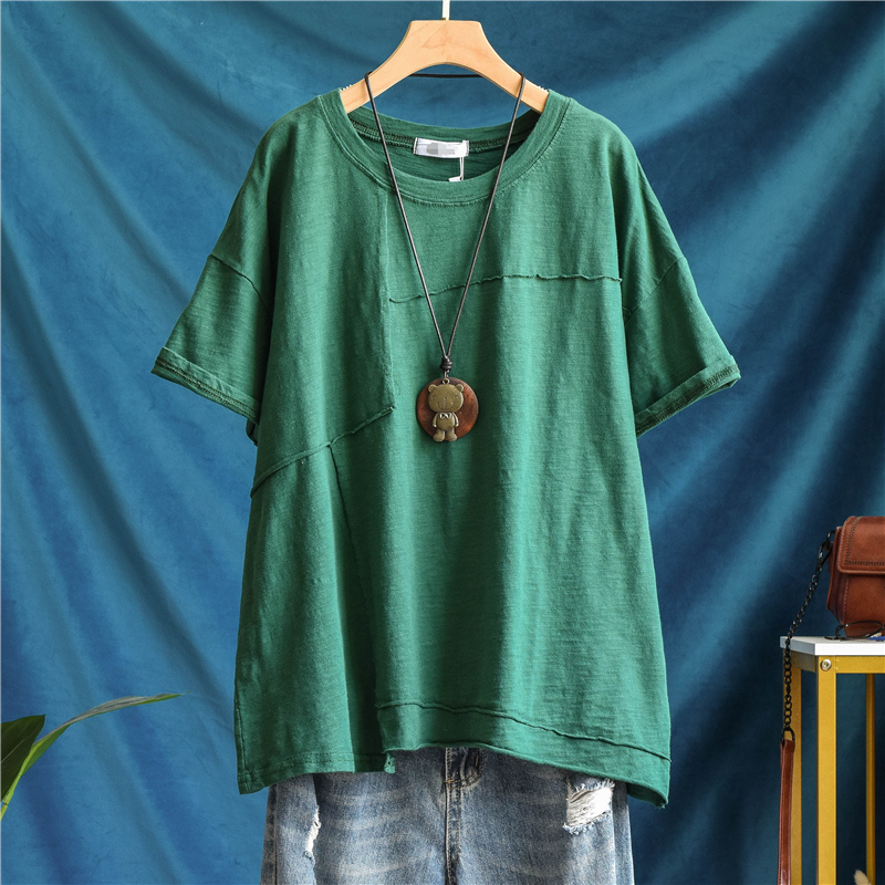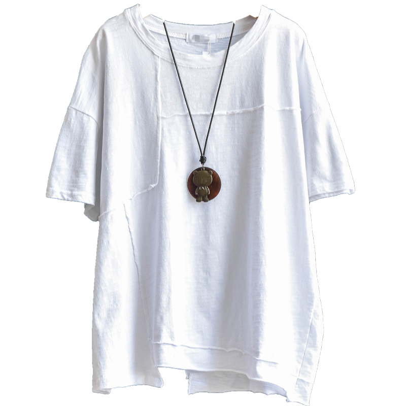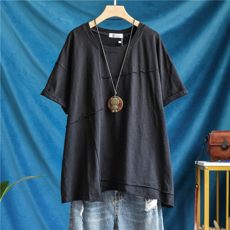 夏款纯棉休闲短袖T恤宽松大码女上衣纯色拼接透气竹节棉薄款潮T