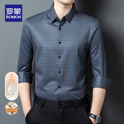 罗蒙春秋新款免烫长袖衬衫男士商务休闲格子翻领高级感抗皱衬衣男