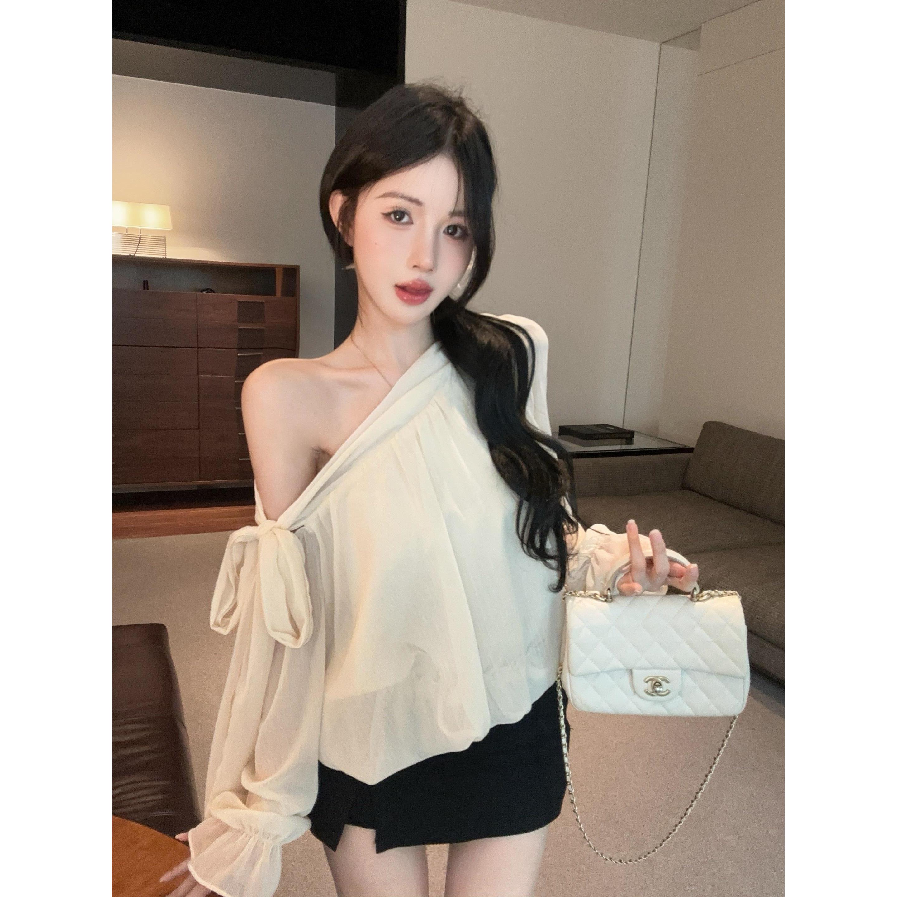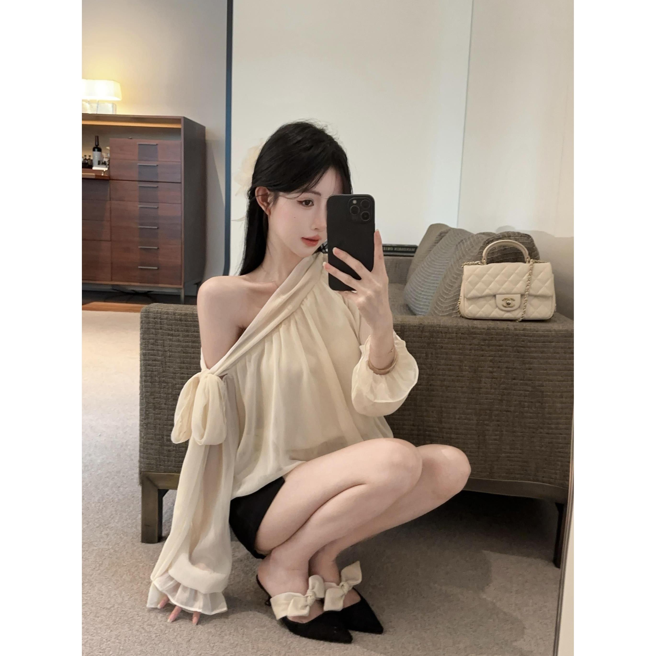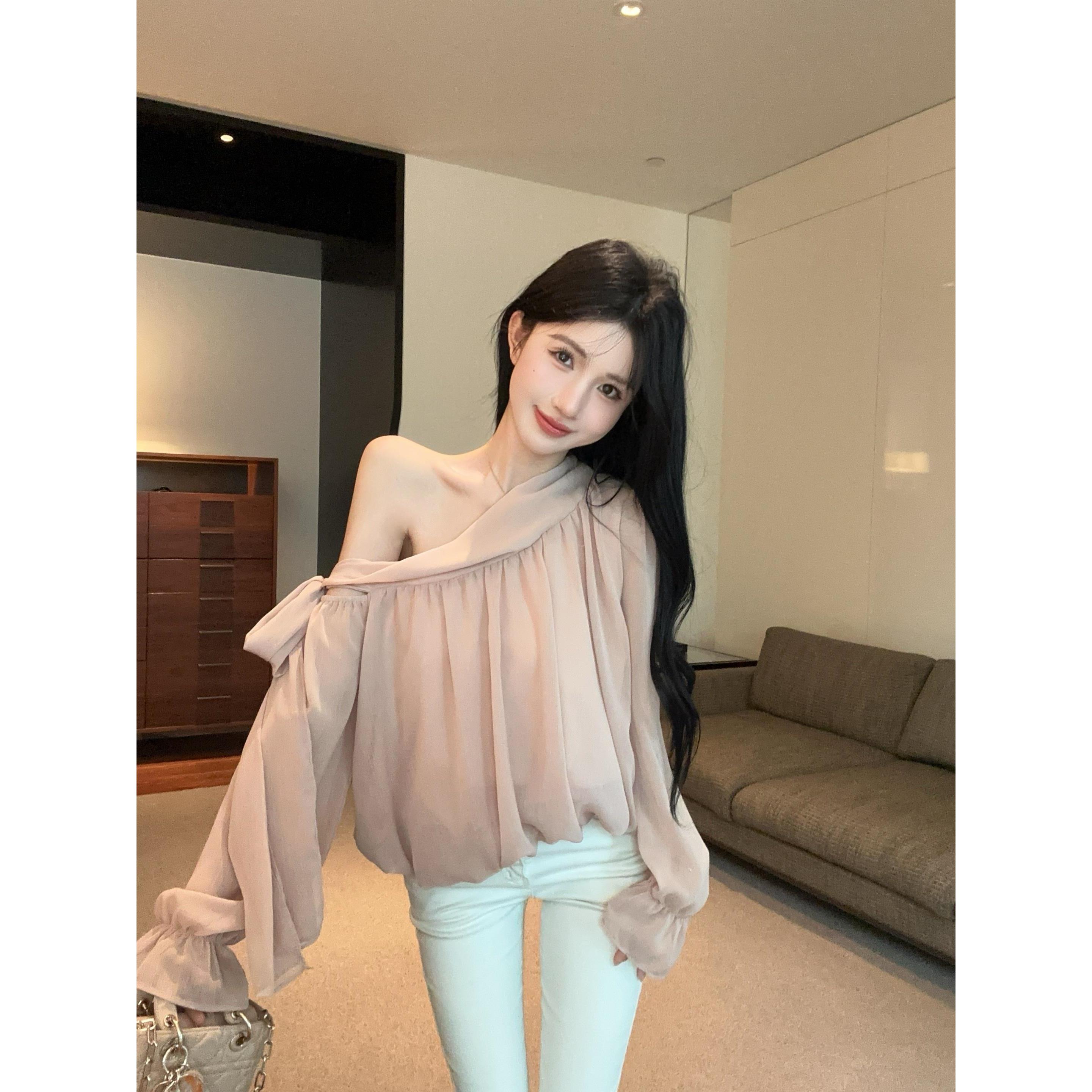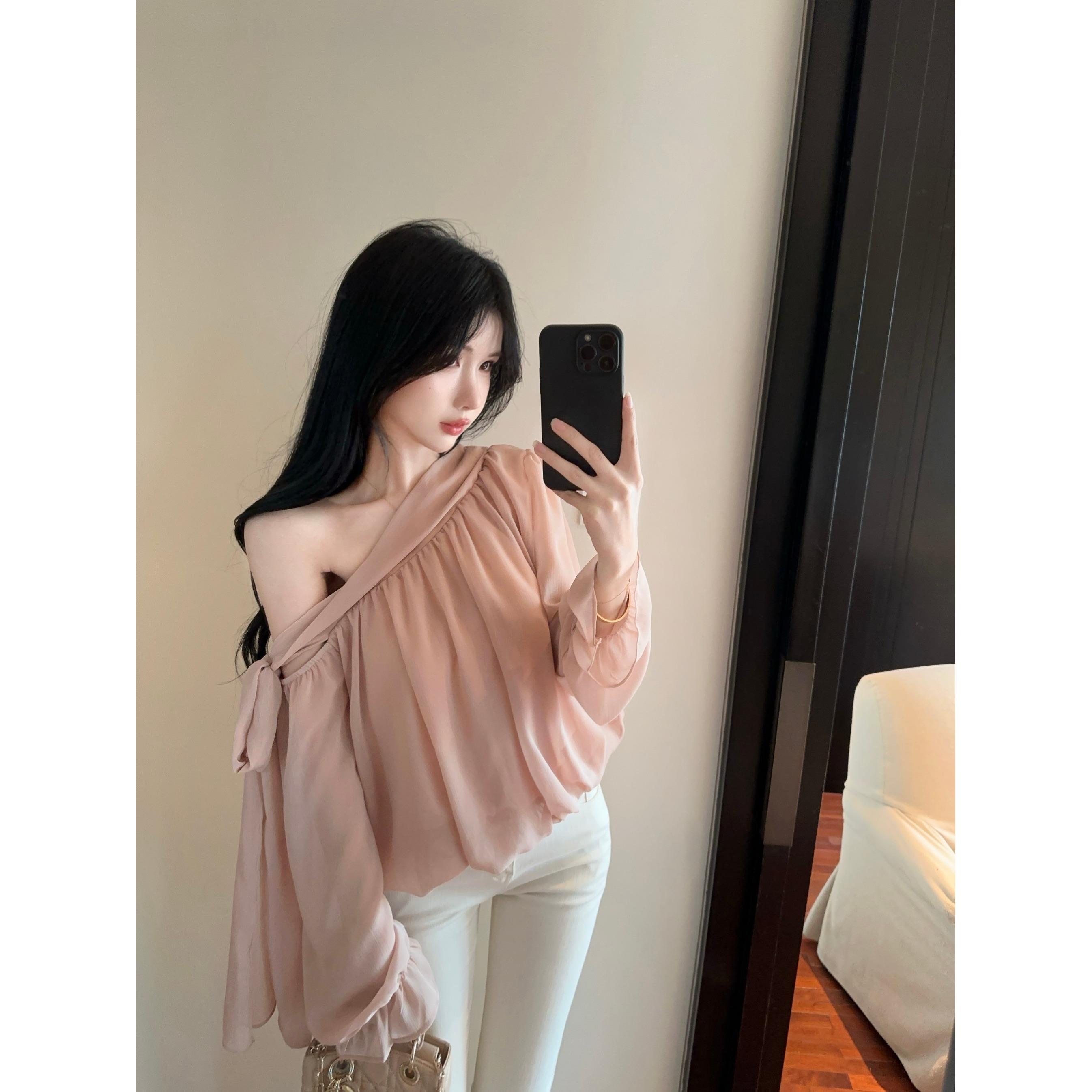 一字肩法式绑带长袖雪纺衬衫女秋季宽松粉色衬衣温柔独特别致上衣