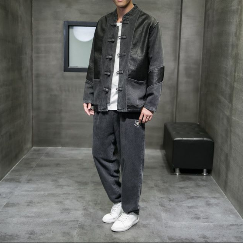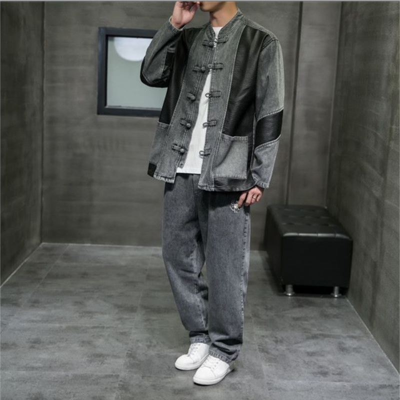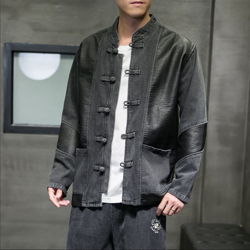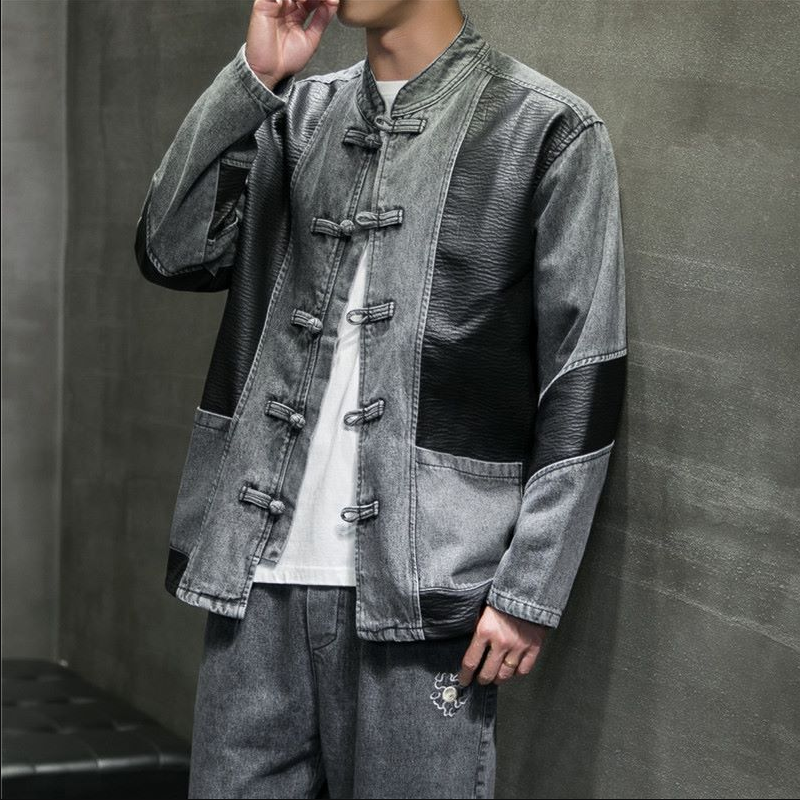 中国风男装拼接牛仔套装唐装男国潮盘扣宽松青年复古中山装外套男