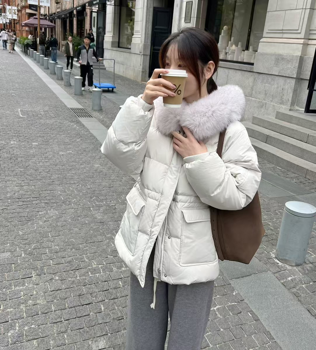 现!韩国东大门正品女装 冬季 大毛领抽绳收腰大毛领轻鹅绒羽绒服