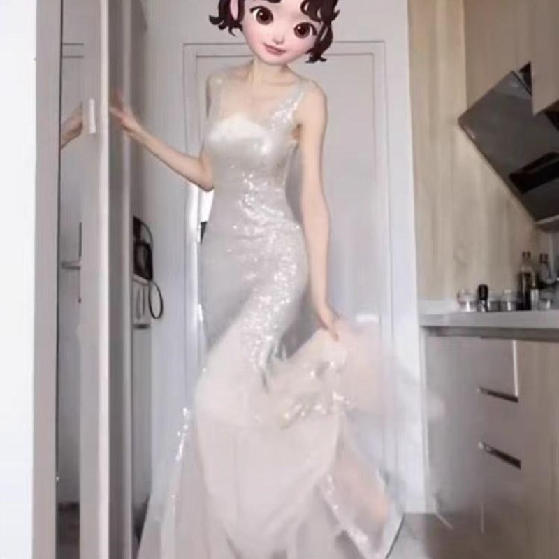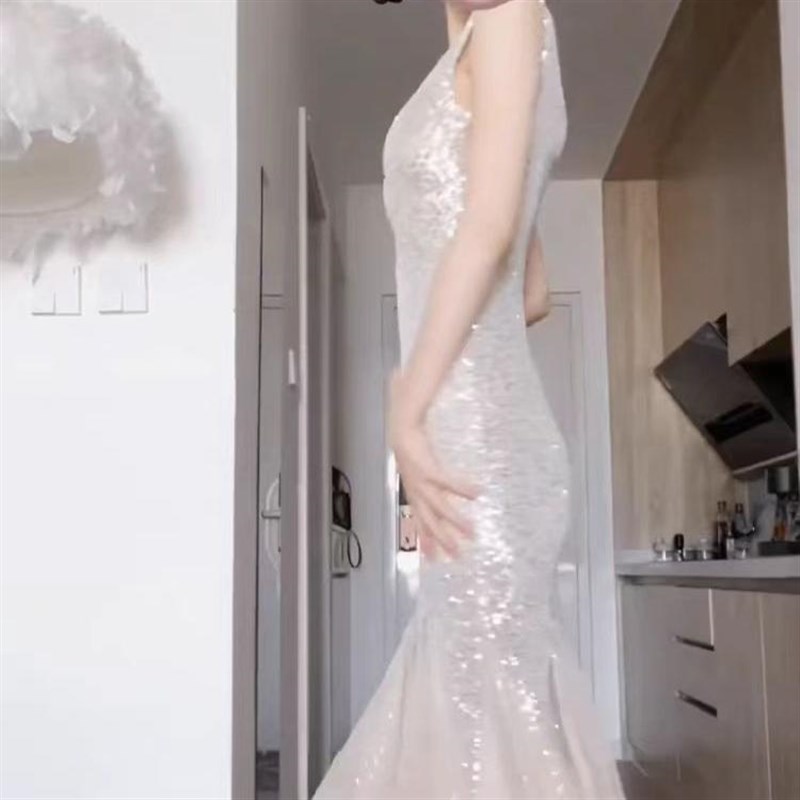 现货速发生日礼服高端轻奢小众轻婚纱亮片吊带长裙晨袍新娘订婚连