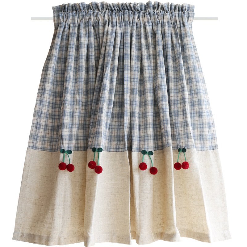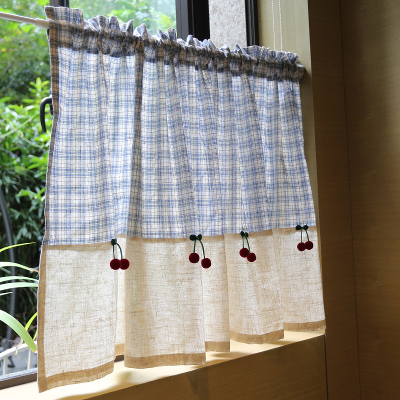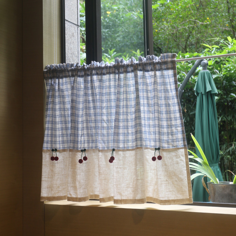 鸢尾乡旅天蓝线格红樱桃半帘窗帘门帘美式乡村穿杆免打孔咖啡帘