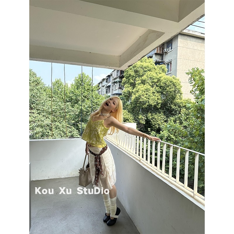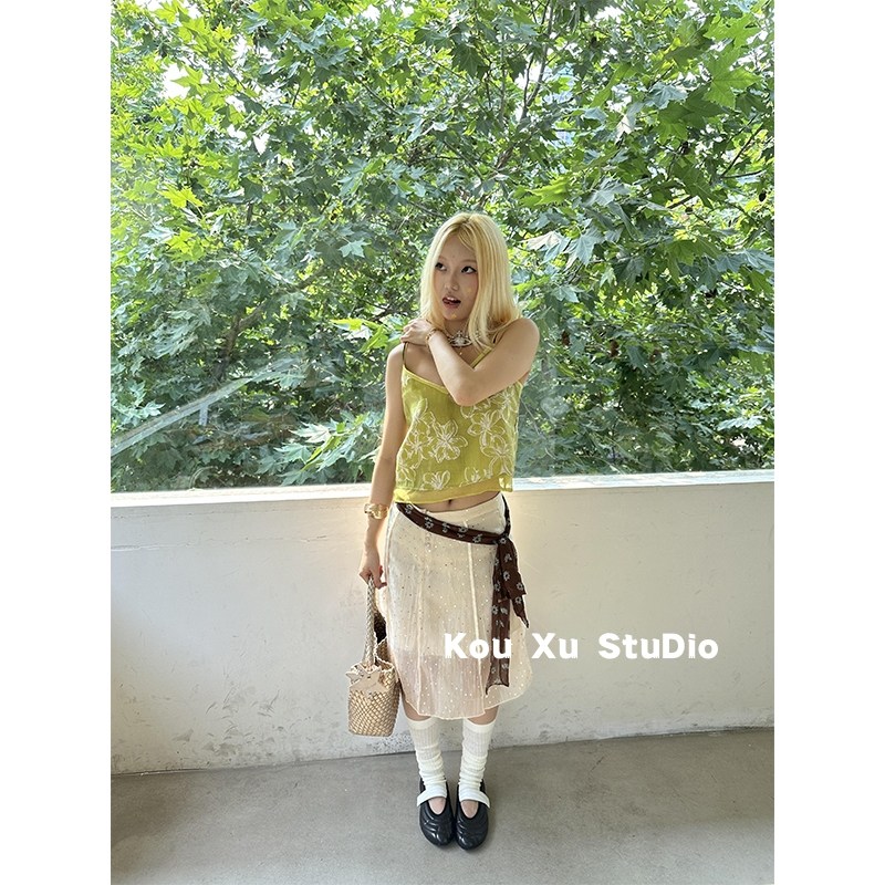 清冷系穿搭套装女春夏显白绿色印花背心吊带高腰显瘦包臀裙半身裙