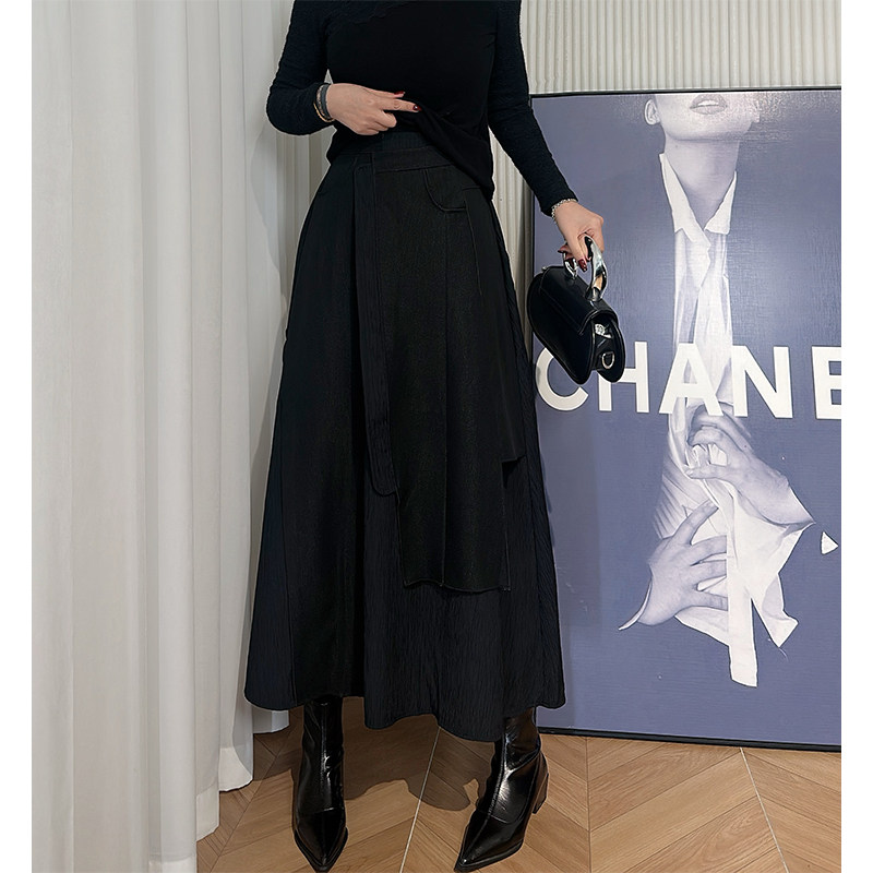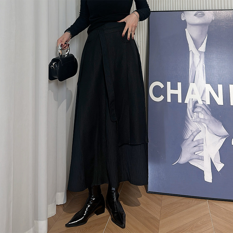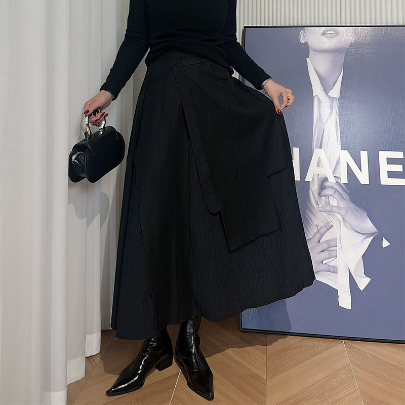 Dan Dan 暗黑风黑色A字半身裙女 松紧腰拼接设计感裙子