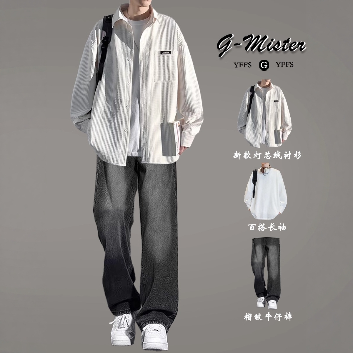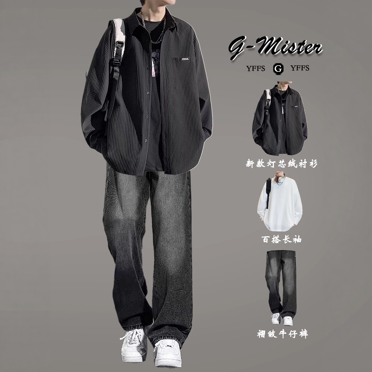 高端长袖衬衫休闲运动套装男春秋2025新款休闲衬衣外套男士三件套
