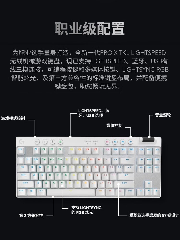 罗技 G PRO X TKL/60无线机械键盘87键蓝牙USB有线三模RGB背光