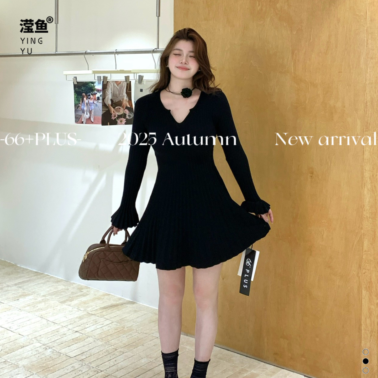 66+PLUS L33015大码简约百搭V领针织连衣裙收腰修身显瘦氛围感裙