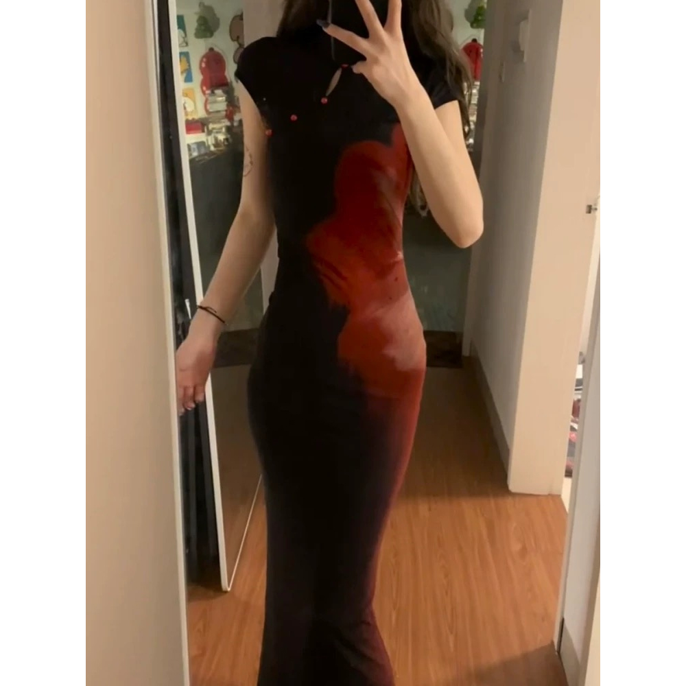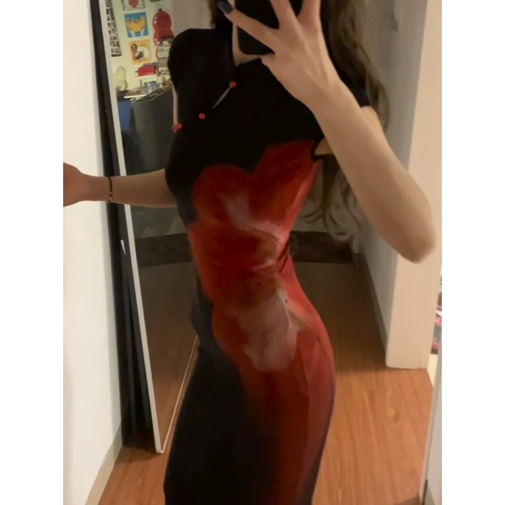 新中式国风盘扣旗袍印花连衣裙女新款性感纯欲风气质收腰包臀长裙
