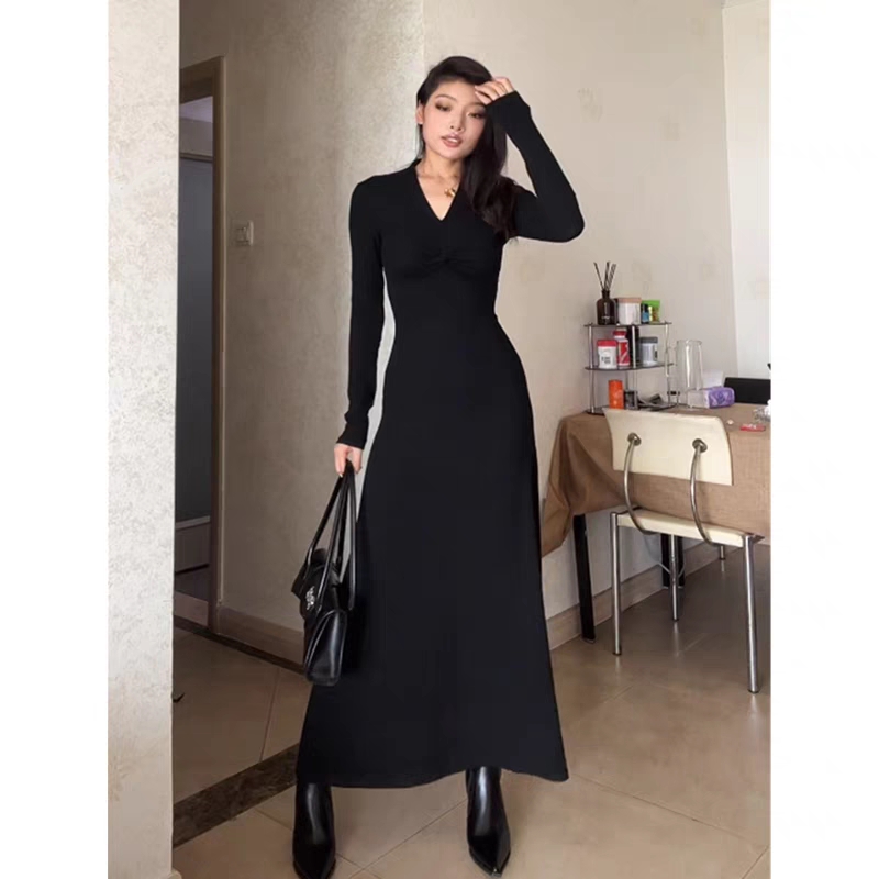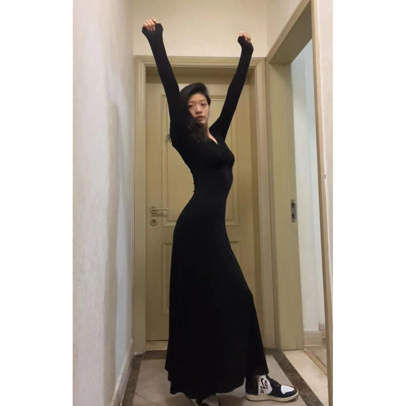长裙女春秋季黑色修身显瘦气质内搭打底裙莫代尔长袖垂坠感连衣裙