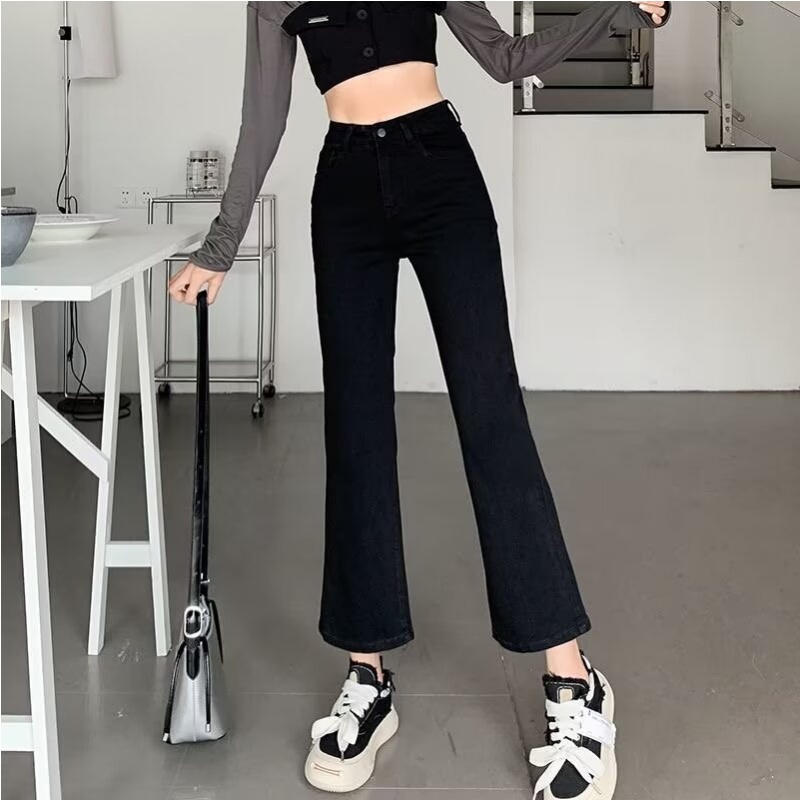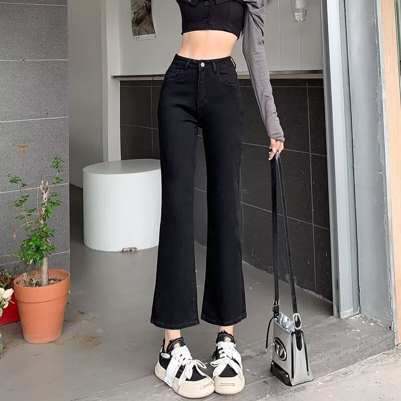 黑色微喇牛仔裤女高腰弹力秋冬加绒厚款小个子矮个子喇叭九分裤子