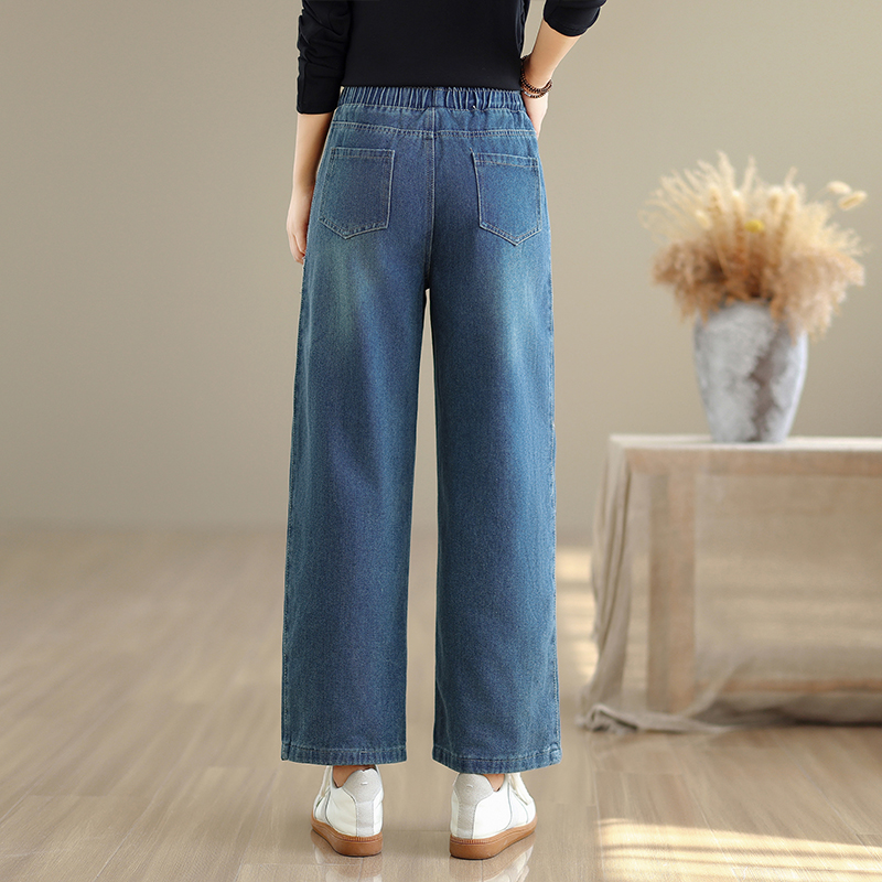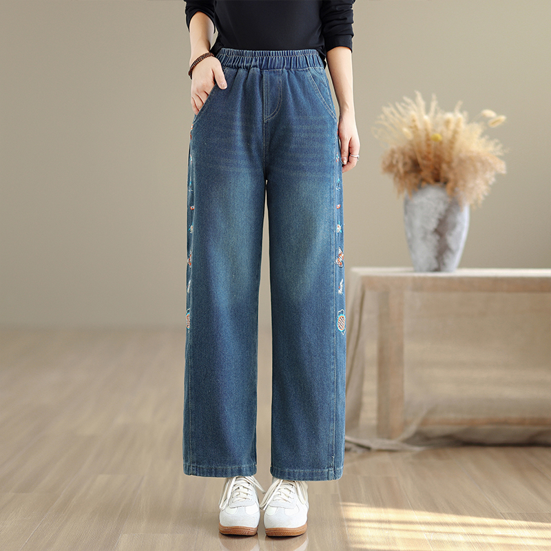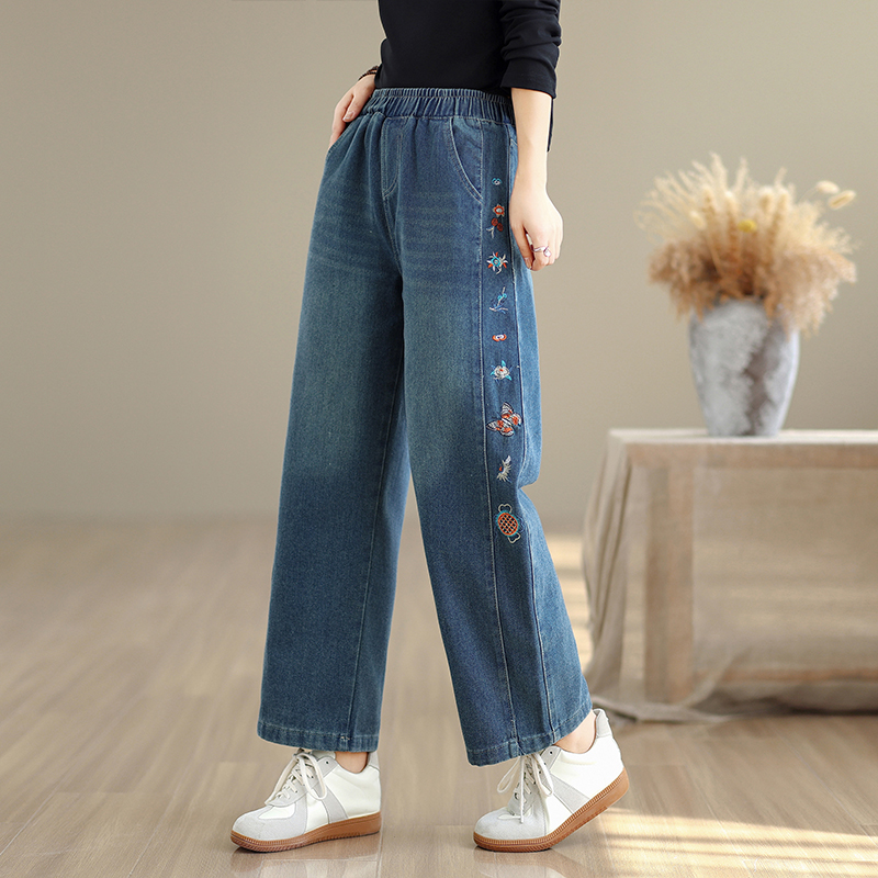 春秋季新款复古刺绣大码牛仔裤女宽松显瘦九分哈伦裤长裤子刺绣