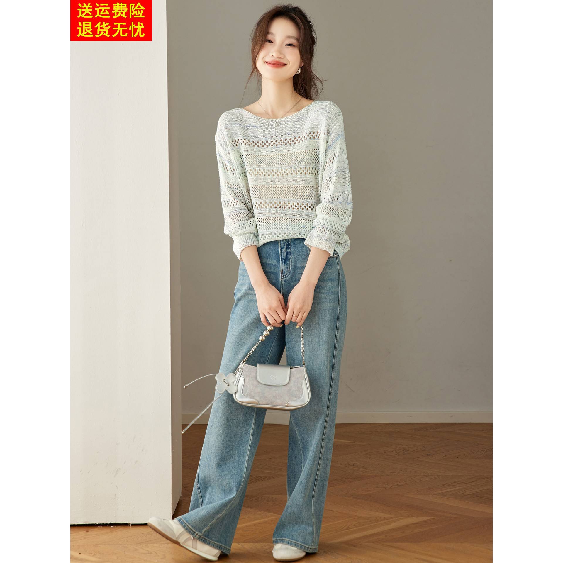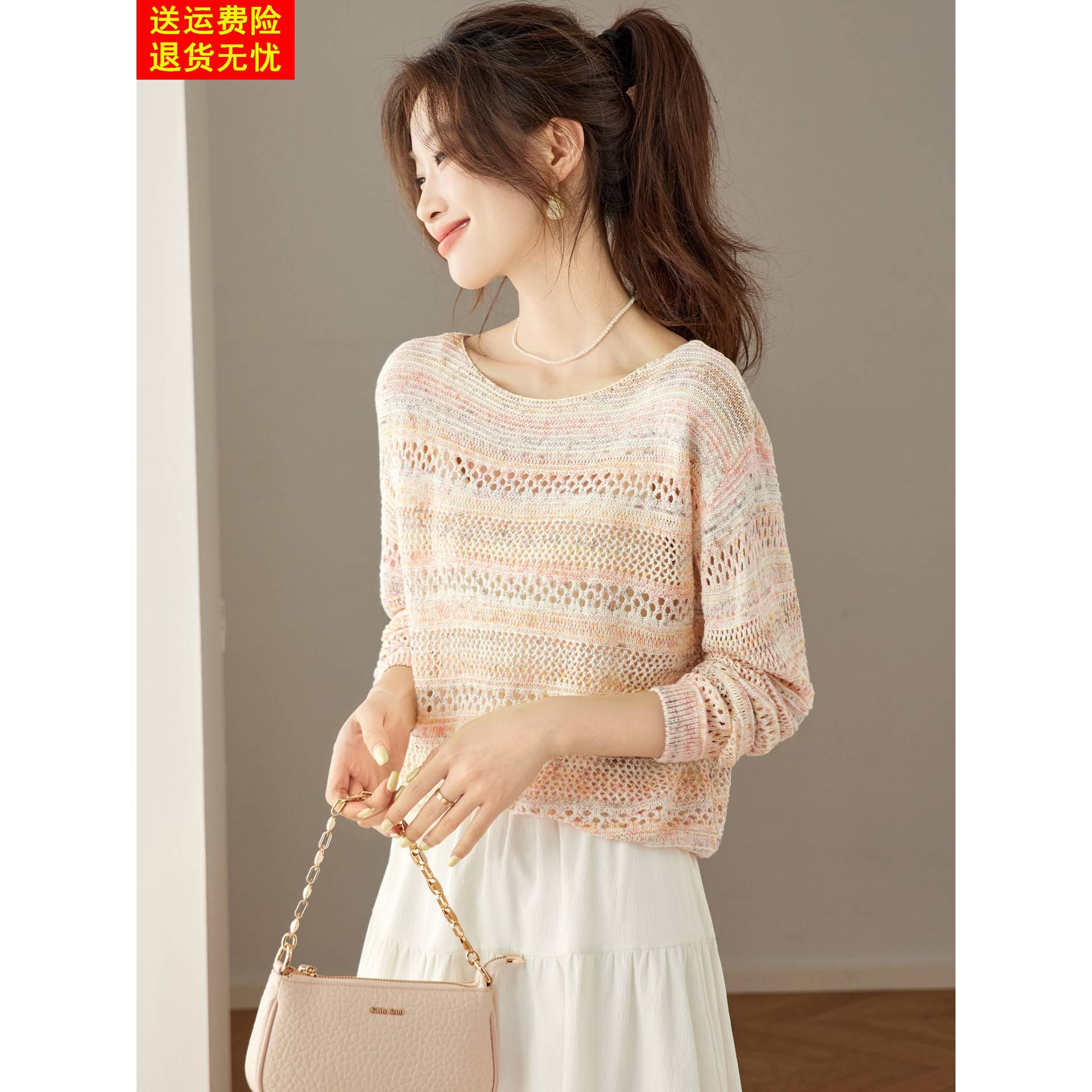早秋花纱镂空一字领针织衫女2025秋季新款长袖打底薄毛衣短款上衣