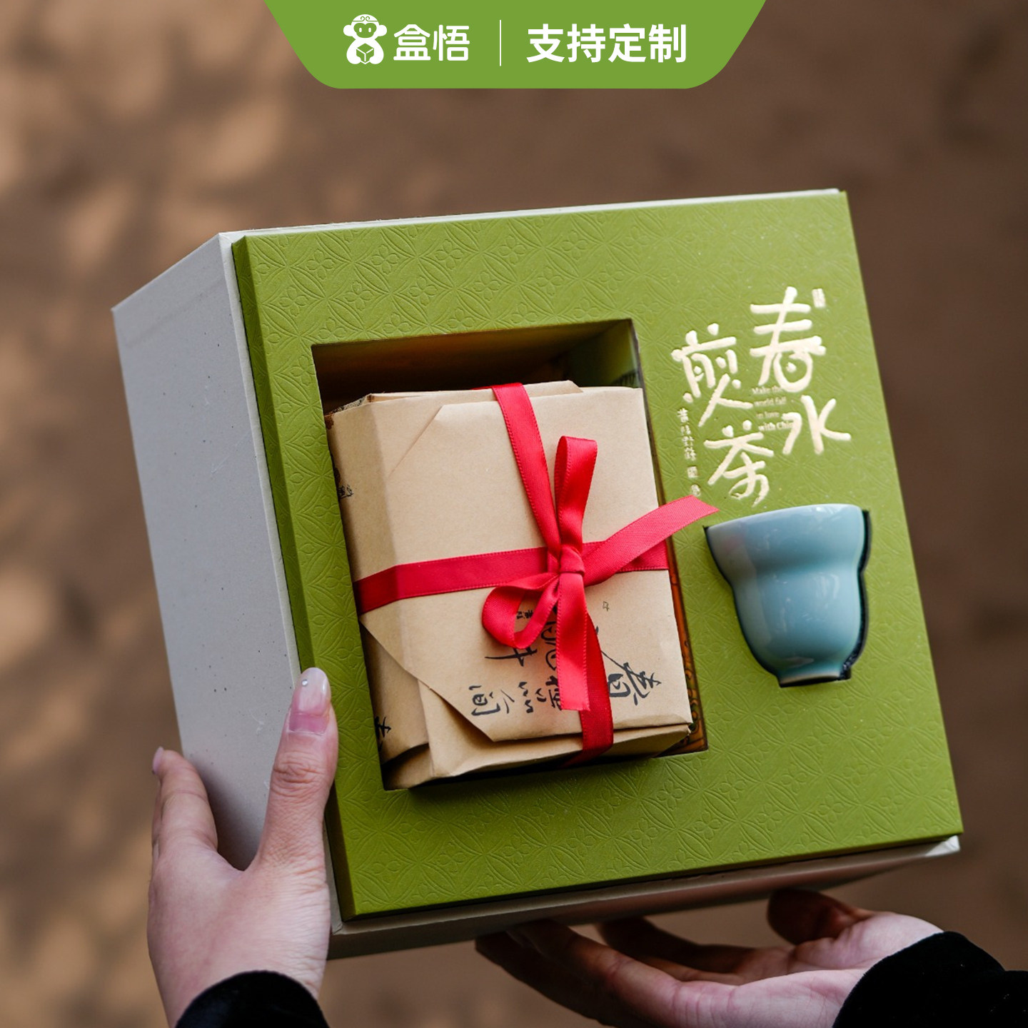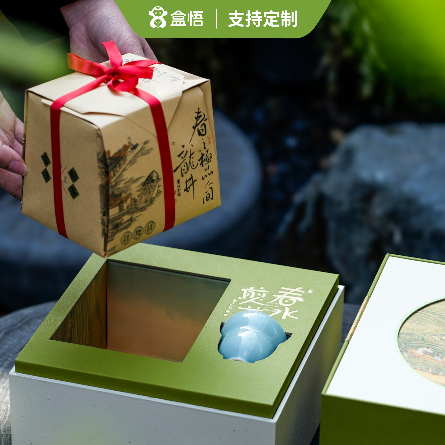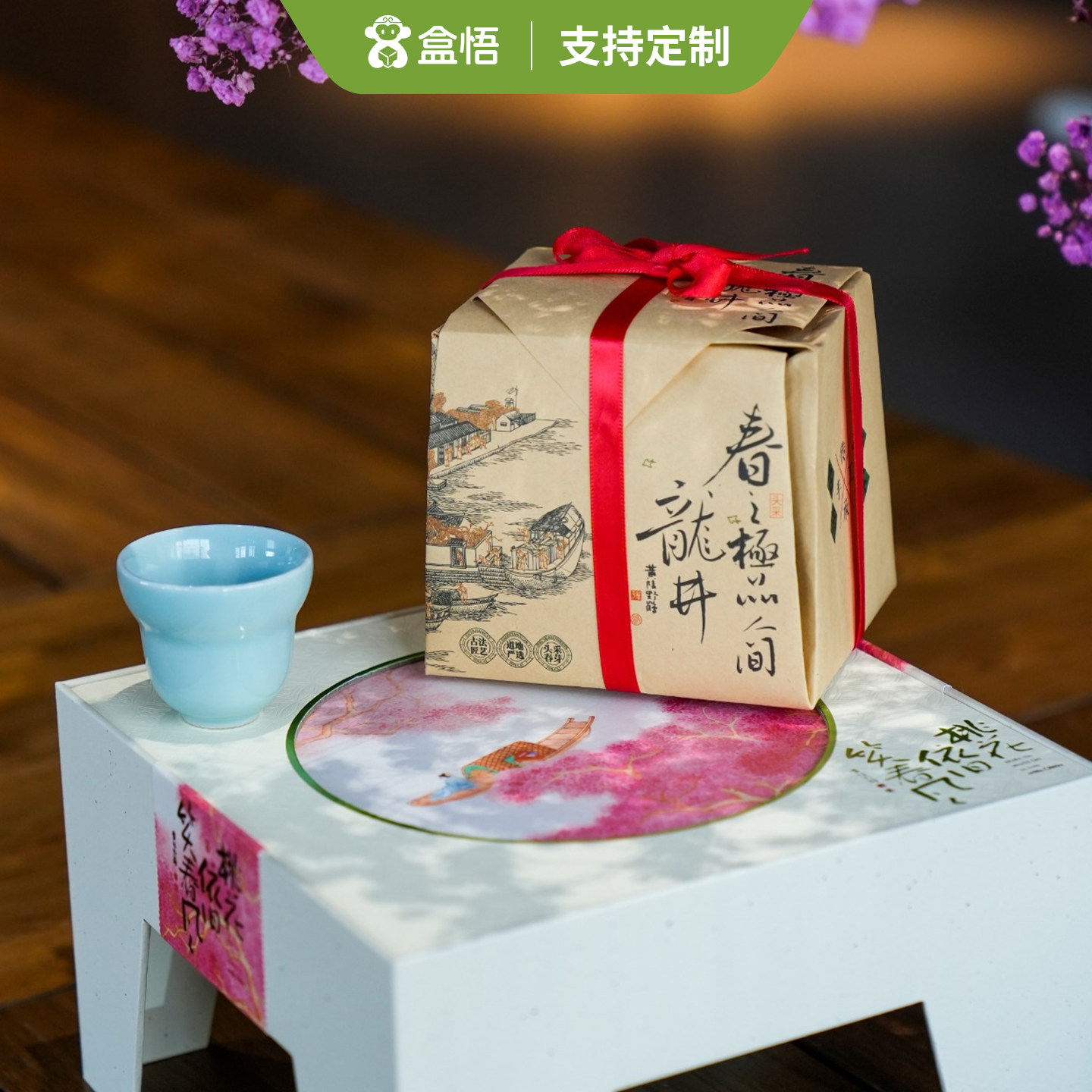 新款明前龙井茶叶方包带汝瓷杯