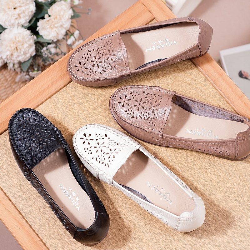 真皮平底鞋女凉鞋洞洞妈妈鞋软底平底中年夏季中老年舒适镂空单鞋