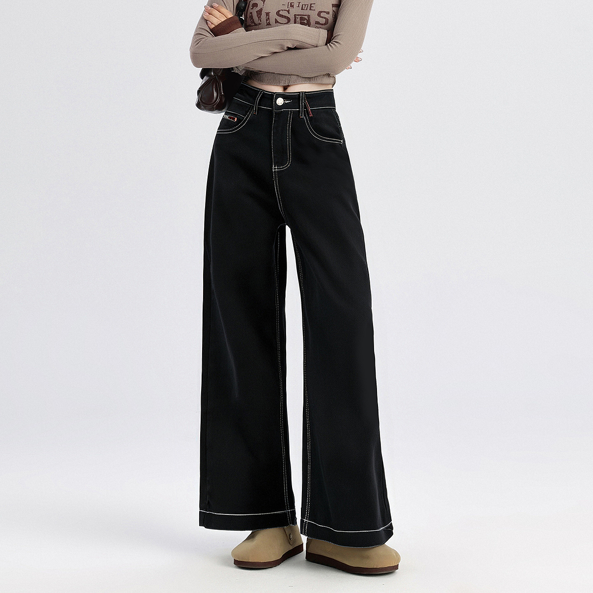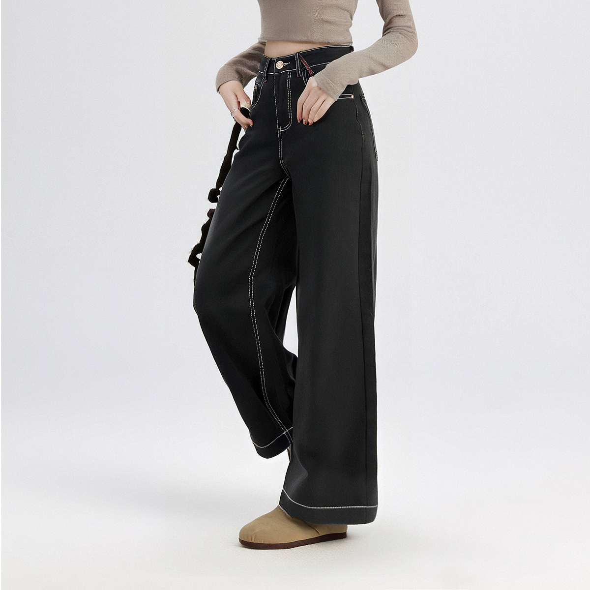 唐狮2025秋冬新款女牛仔裤明线撞色阔腿直筒长裤女美式宽松潮
