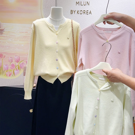 春天的清新软糯~韩代款温柔减龄正肩上衣粉黄色针织开衫毛衣大码